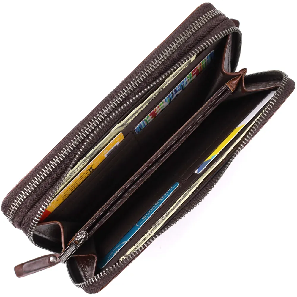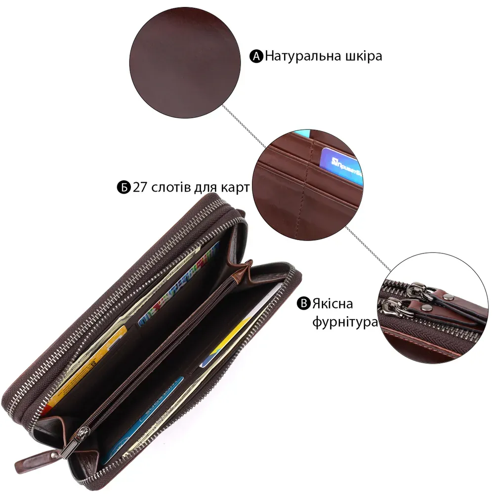 Модель включає два повноцінні відділення, кожне закривається на блискавку. Усередині — зручна організація простору: відділення для купюр, кишеня на блискавці для документів або готівки, чотири прилеглі кишені та двадцять сім осередків для пластикових карток. Все продумано до дрібниць для вашого комфорту.