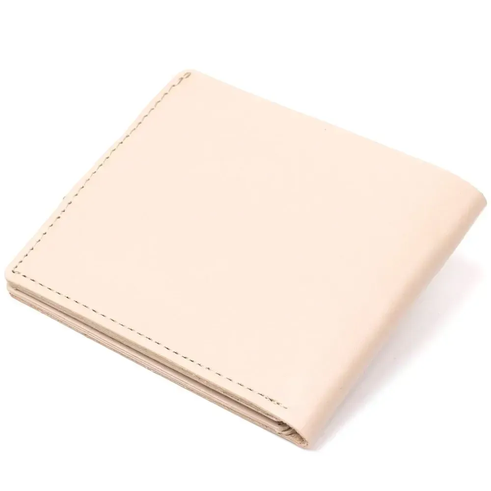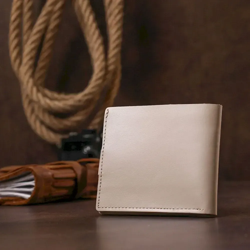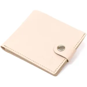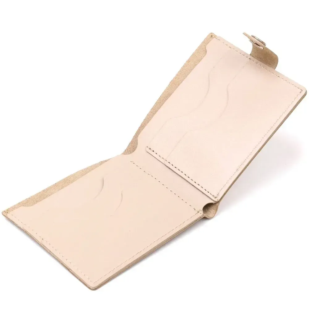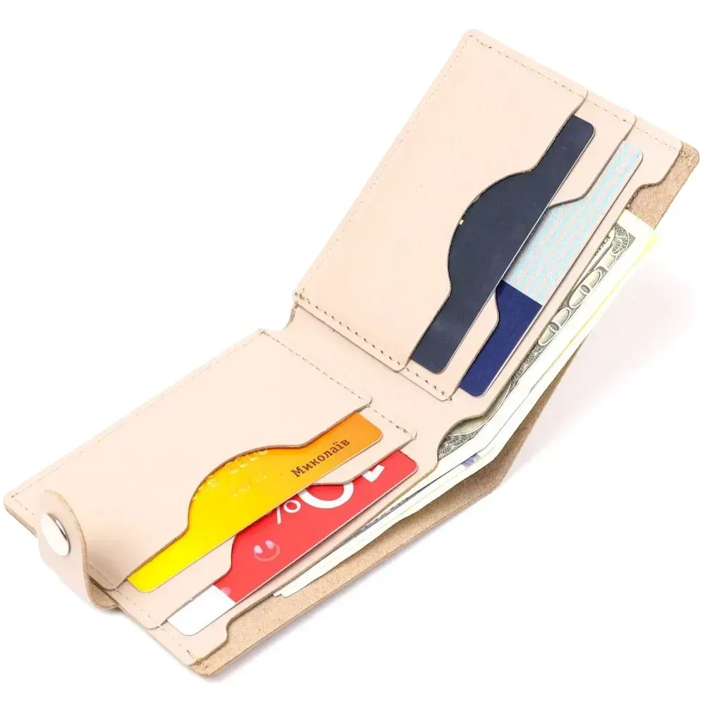 Небольшое практичное портмоне от украинского производителя в красивом бежевом цветет и гладкой фактуре. Внутри есть просторное отделение для купюр и кармашки для пластиковых карточек. Закрывается аксессуар с помощью кожаного хлястика на кнопке, что очень удобно. Данная модель отлично подойдет на подарок любимому человек на любой праздник.