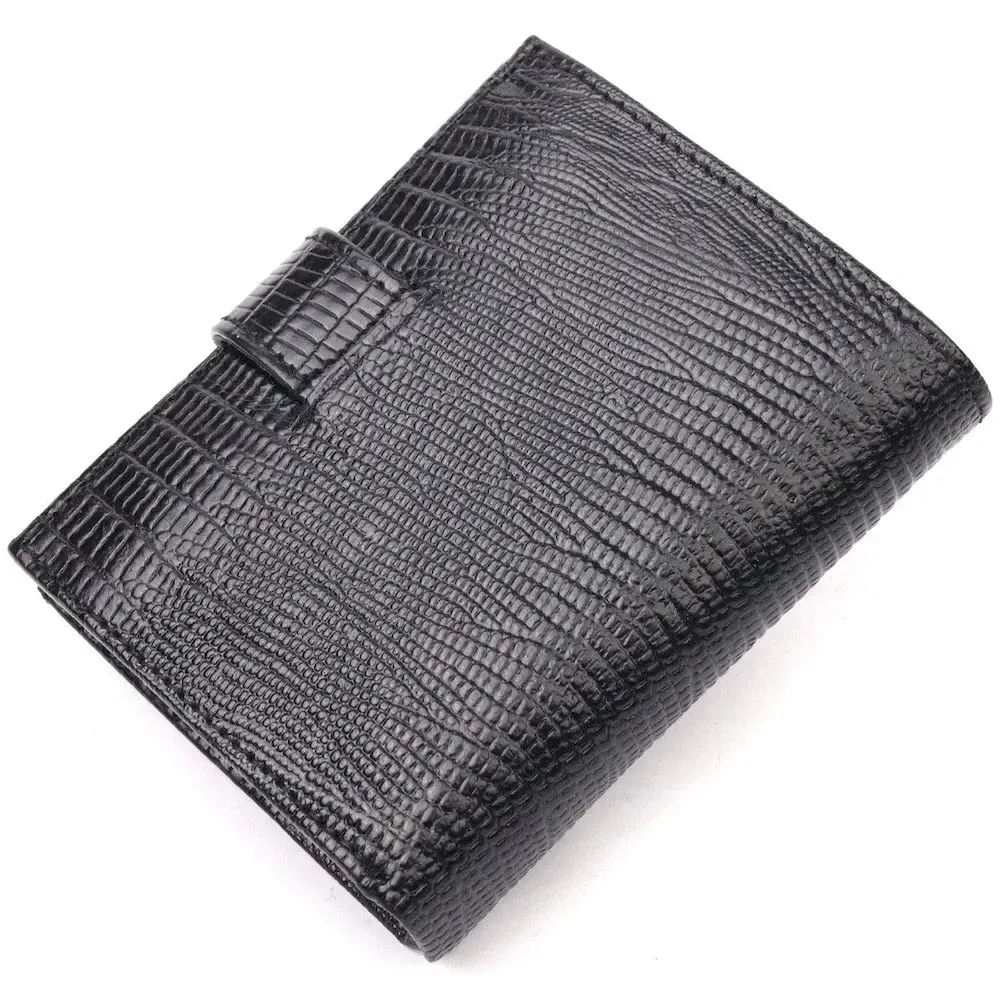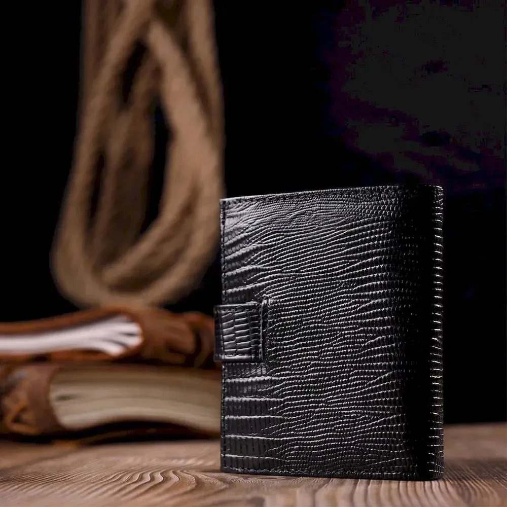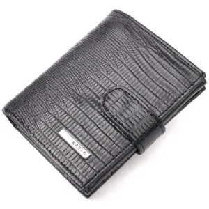 Вместительный мужской кошелек из натуральной кожи с тиснением под рептилию, в черном цвете. Особенностью данного аксессуара есть наличие блока для кредитных карточек, что закрывается хлястиком на кнопку. Изделия закрывается на хлястик с кнопкой. На лицевой стороне в виде декора расположен металлический логотип производителя. Аксессуар упакован в фирменную коробочку. Изделия из натуральной кожи всегда будут отличным подарком для близкого человека.