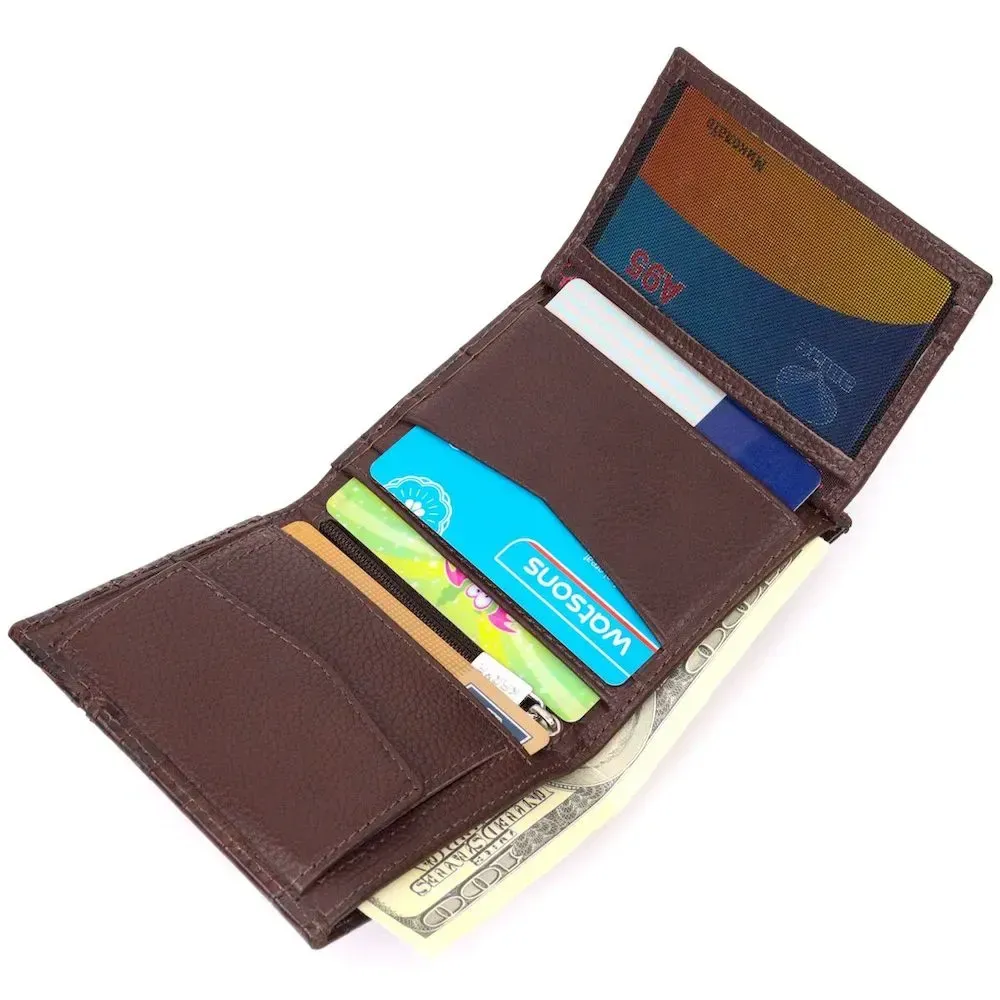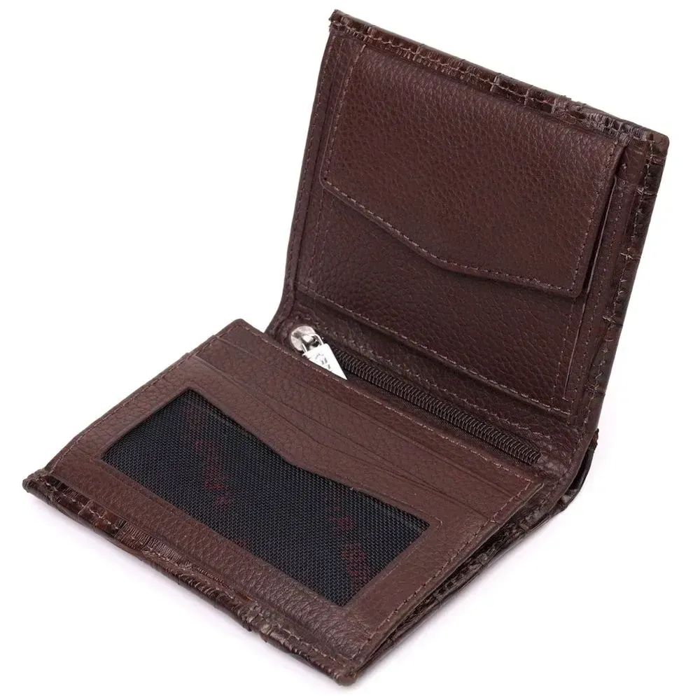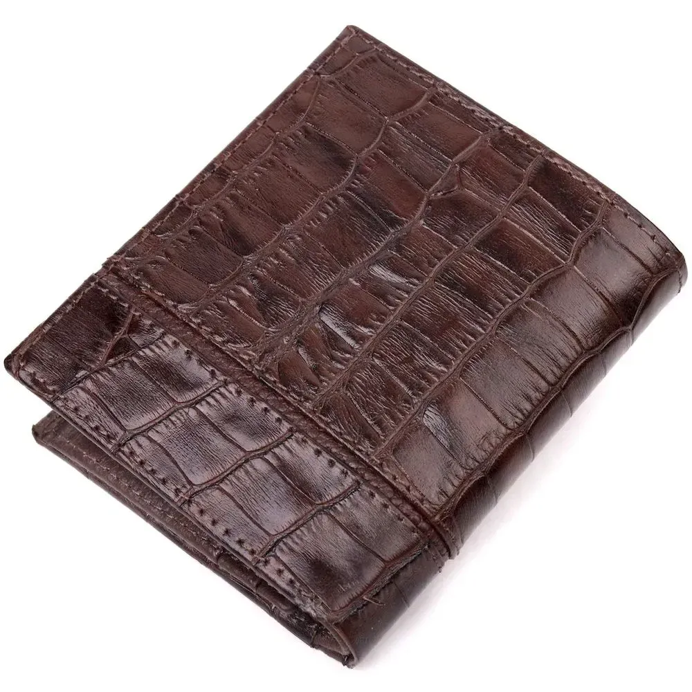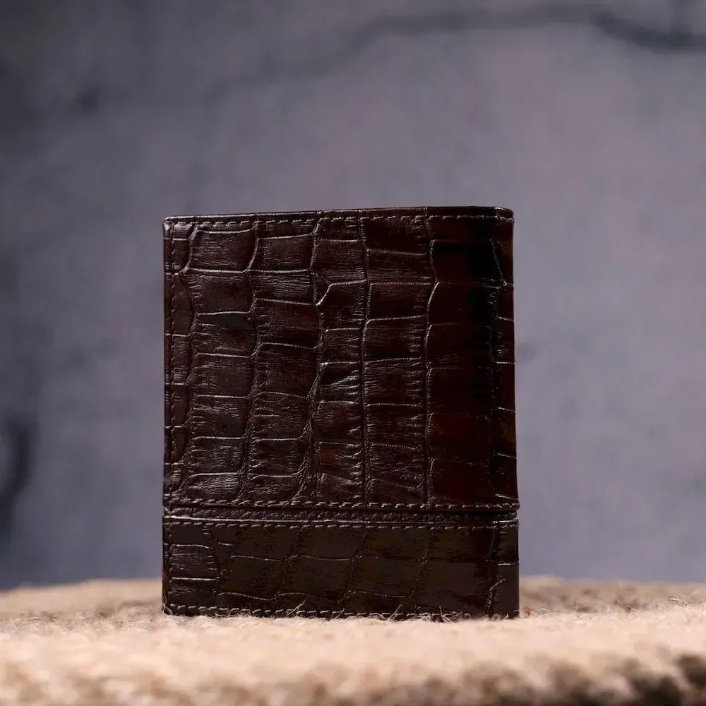 Практичный мужской кошелек, из натуральной кожи с тиснением под крокодила, в красивом коричневом цвете. Изделие имеет приятный блеск. Внутри находится два отделения для купюр, шесть отделений для карт, три скрытых кармана и монетница на кнопке. Закрывается кошелек в два сложения без застежки. Изделия из натуральной кожи всегда будут отличным подарком для близкого человека.