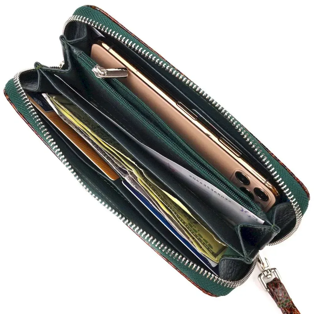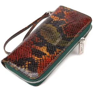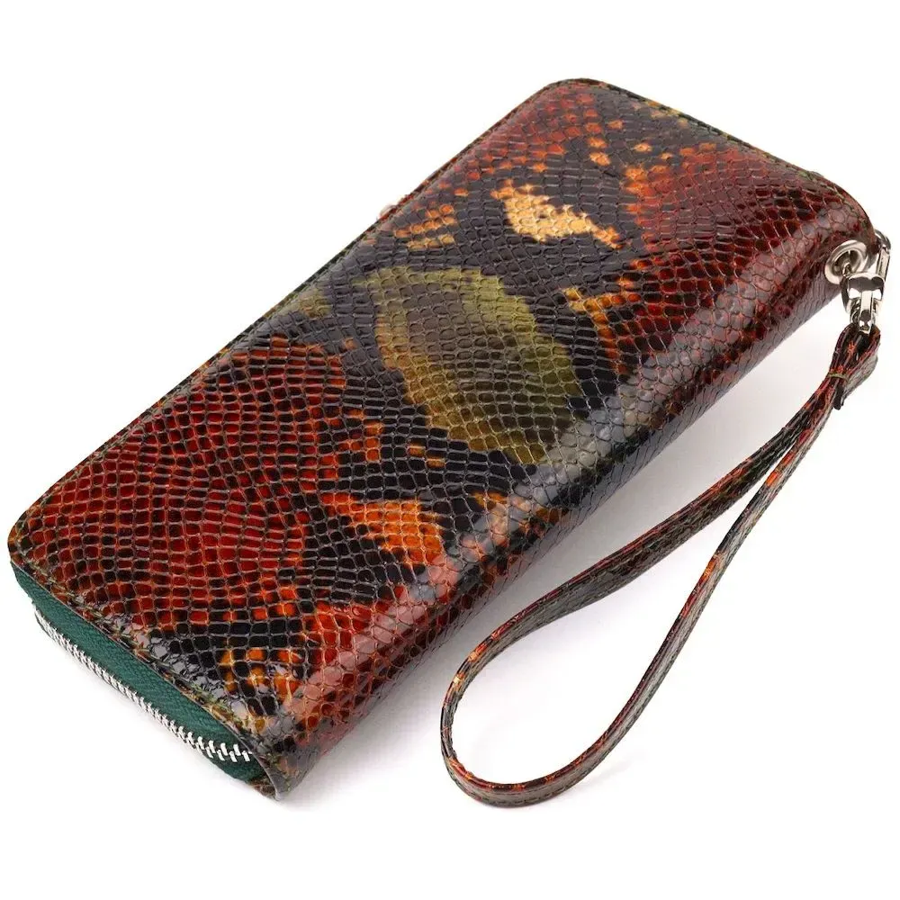 Красивый женский кошелек, из натуральной кожи с тиснением под змею. Аксессуар имеет три основных отделения, в которые помещаются купюры всех номиналов, две перегородки, одна из них на молнии, восемь карманов для карточек, два прилегающих кармана и съемный кистевой ремень. Закрывается аксессуар на молнию. Отличный аксессуар, надежного производителя, который прослужит очень долго.