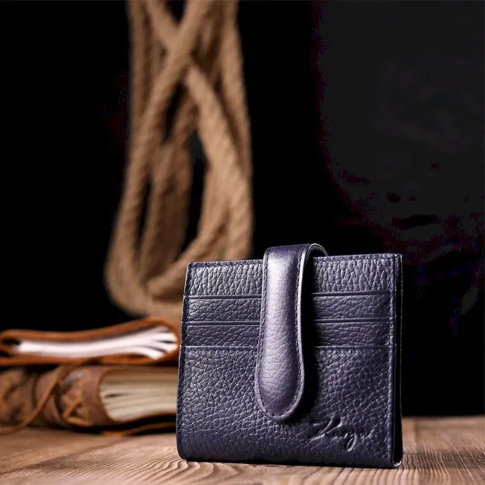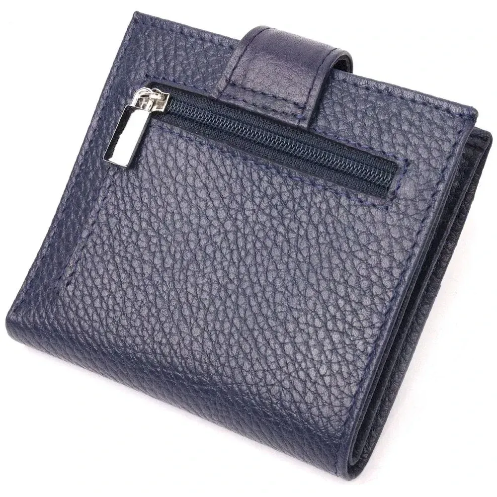 Практичный женский кошелек из натуральной кожи высокого качества. Внутри есть отделения для купюр и ячейки для кредитных карт. В изделии использована качественная фурнитура, а также прочная фирменная подкладка. Не большой кожаный кошелек поместится даже в самую маленькую сумочку. Закрывается модель на кожаный хлястик с кнопкой. Такой кошелек, однозначно, порадует любую женщину.
