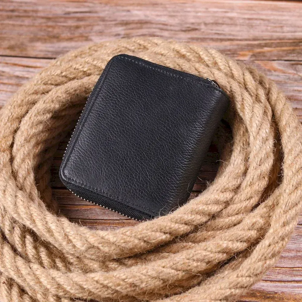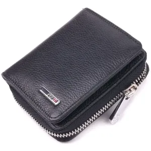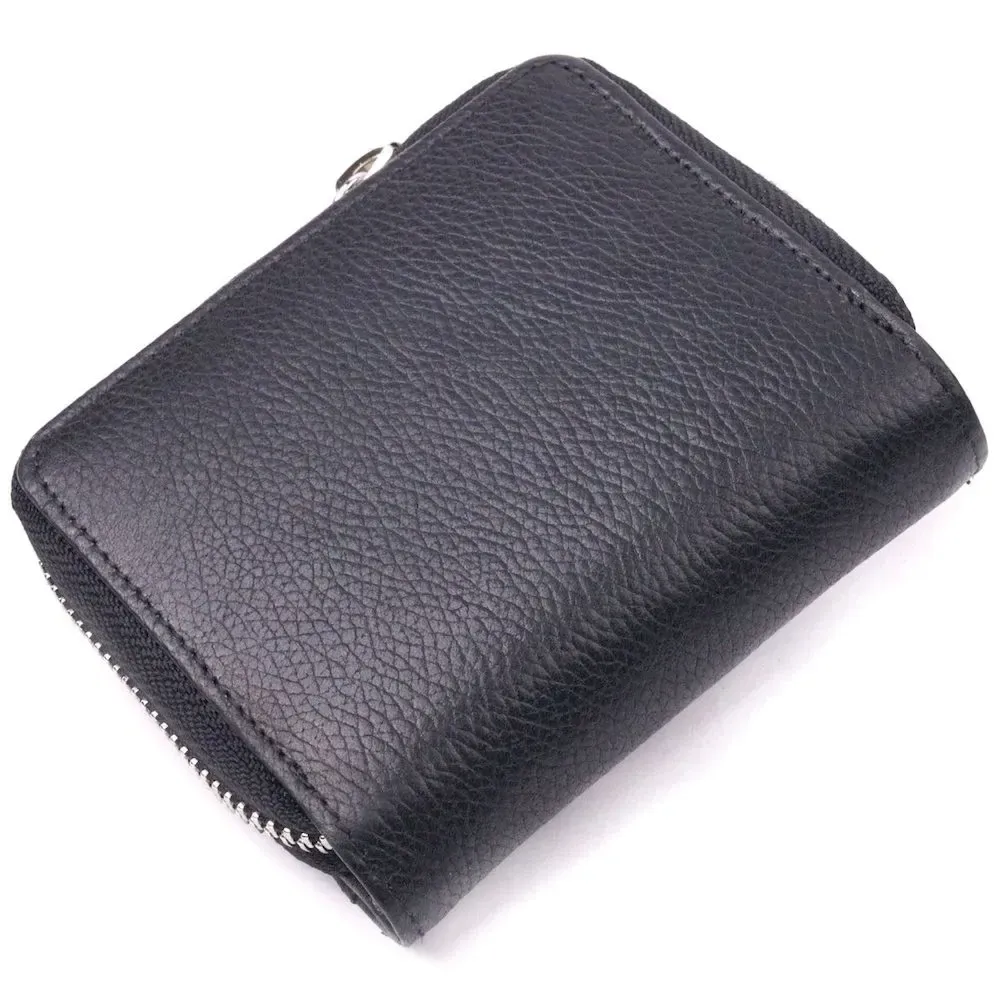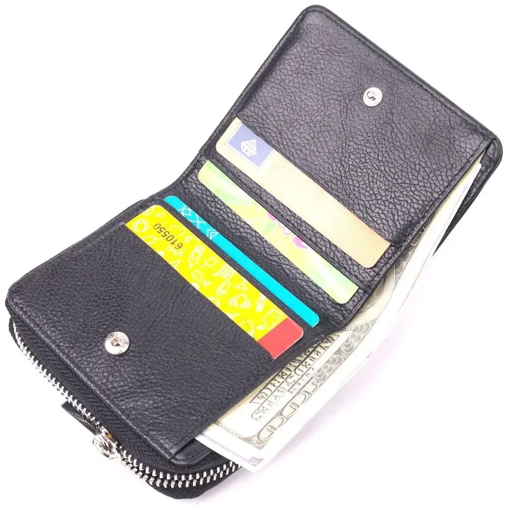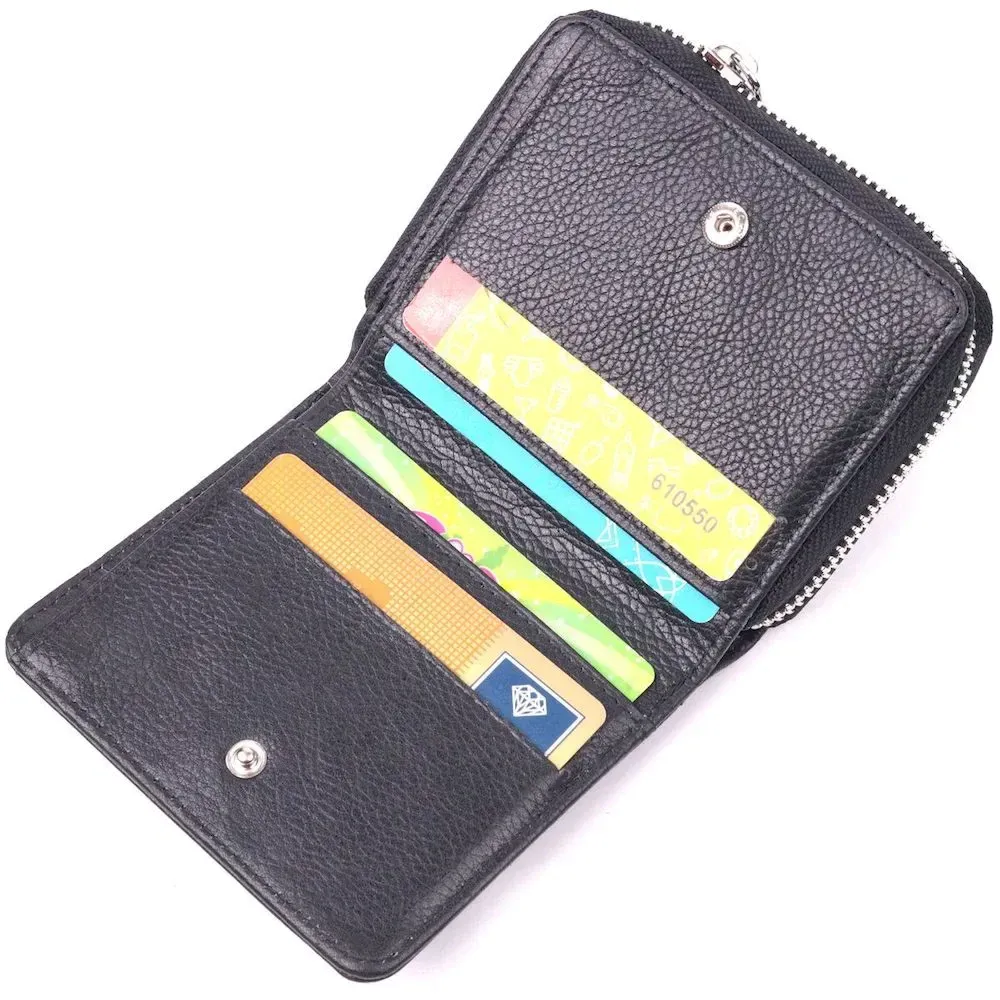 Удобный женский кошелек из натуральной кожи в классическом черном цвете. Изделие состоит из одного вместительного отделения для купюр, четырех прилягающих карманов, четырех слотов для карт и монетницы на молнии. Складывается аксессуар пополам, с фиксацией кнопку. Качественная фурнитура дополняет и украшает изделие. Такой кошелек из натуральной кожи - это идеальный вариант на каждый день для тех, кто ценит качество, удобство и комфорт, а также будет отлично дополнять Ваш повседневный образ.