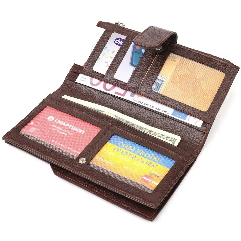 Современный женский кошелек, из натуральной кожи. Аксессуар имеет шесть прилегающих карманов, в которые поместятся купюры всех номиналов, вместительную монетницу и двадцать карманов для карточек. Закрывается аксессуар хлястиком на кнопку. Если Вы хотите порадовать и себя и удивить близких, то непеременно покупайте кожаные аксессуары в нашем магазине, качество и цена Вас однозначно порадует.