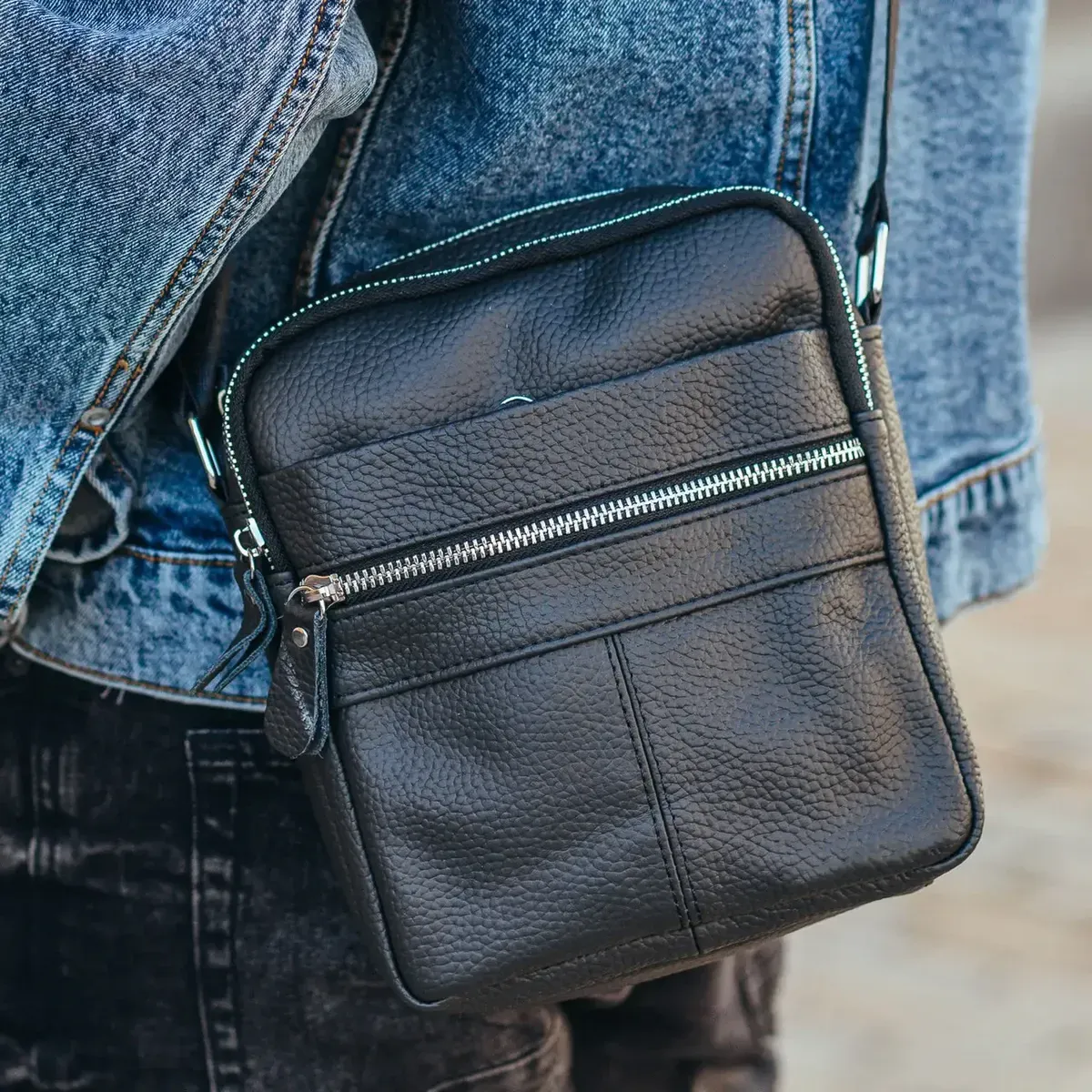 На цій сторінці представлена сумка середнього розміру. Має достатню кількість кишень та відділень для зручної організації особистих кишенькових речей та інших предметів. Ця сумка акуратно пошита із справжньої зернистої шкіри, стійкої до потертостей завдяки спеціальній обробці. Металева фурнітура не тільки є одним із найкращих варіантів для такого виробу, але й гармонійно поєднується із чорним кольором сумки.