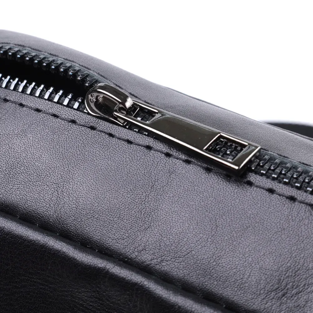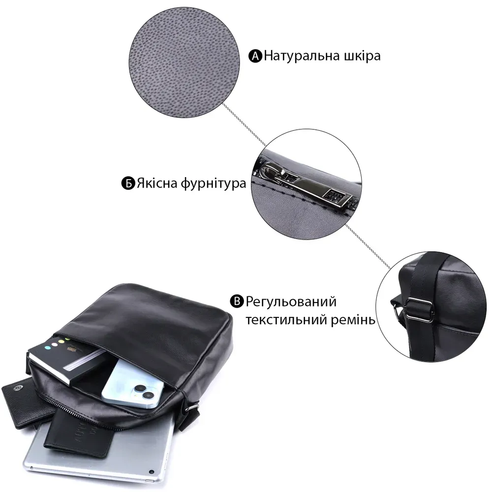 Практична чоловіча сумка месенджер, в яку помістяться всі ваші необхідні речі. Фурнітура металевого кольору - стійка не змінює свій колір у процесі носіння. Чудова чоловіча сумка вертикального формату виготовлена з натуральної гладкої шкіри чорного кольору. Аксесуар чудово поєднується з усіма стилями в одязі та може стати чудовим подарунком на будь-яке свято.