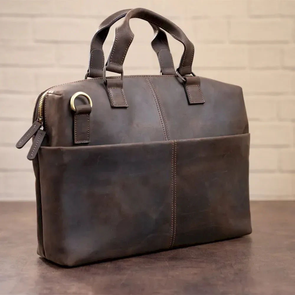 Солидная кожаная сумка для ноутбука. Идеальное решение для деловых людей. В сумку поместится стандартный ноутбук. Вы можете носить аксессуар, как в руках, так и на плече с помощью съемного плечевого ремешка. Украинское производство. Изделие изготовлено из винтажной кожи, которая известна за свой эффект старины. Со временем на сумке появляются потертости и царапины, за что ее так любят наши клиенты. Мы уверены, что дизайн сумки оценит любой мужчина. Она классическая и при этом очень функциональная. По краям сумки ровная строчка коричневого цвета. Изделие упаковано пылезащитный чехол.