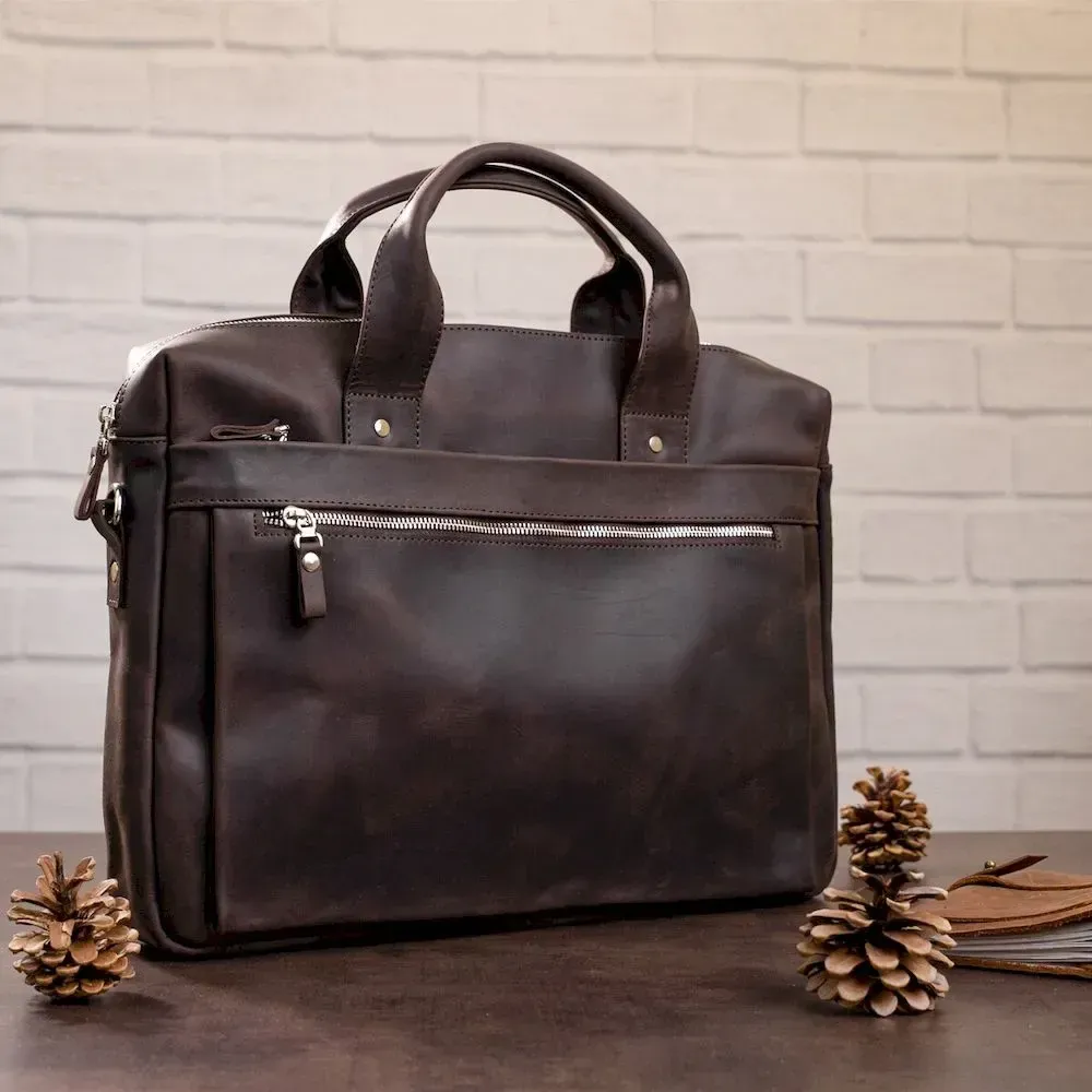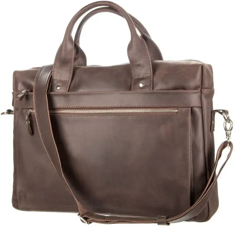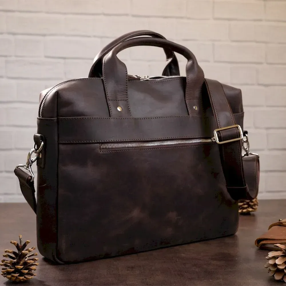 Прочная мужская сумка - из винтажной кожи высокого качества, иногда её называют «crazy horse» или просто «crazy», для неё характерны потертости, искусственные царапины и неоднородность окраса. Из-за этого изделия из такой кожи дольше держат презентабельный внешний вид. Из дополнительных материалов, установлена надежная металлическая фурнитура, а для подкладки взято крепкий текстиль.