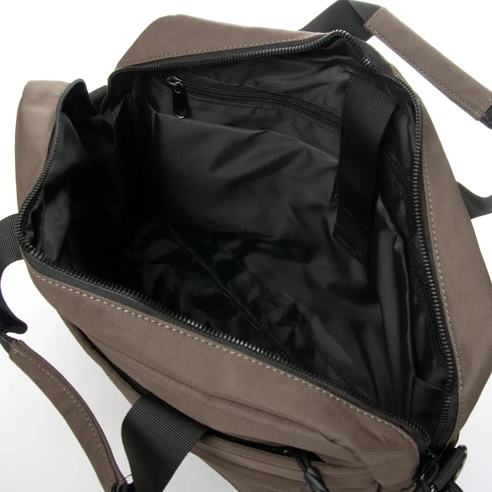 Одно основное отделение закрывается на молнию. Внутри есть карман для ноутбука, двойной открытый боковой карман и большой карман на молнии для бумаг формата А4. Снаружи сумки на фасаде расположены два больших кармана на молнии. На обратной стороне сумки есть вместительный карман на молнии и крепление на ручку чемодана.
