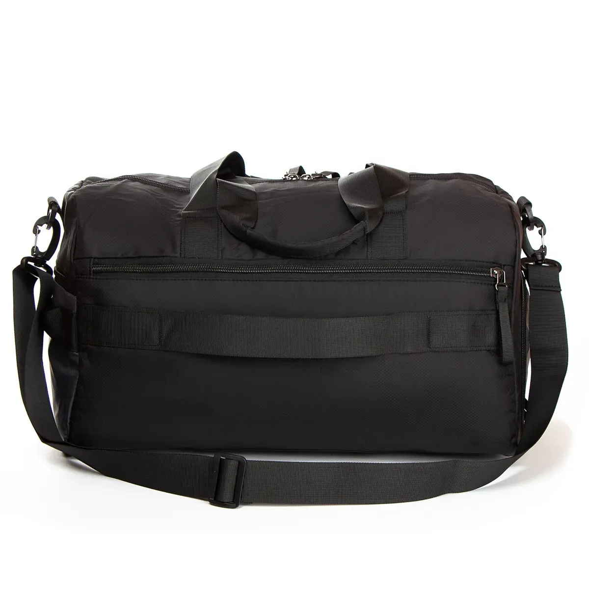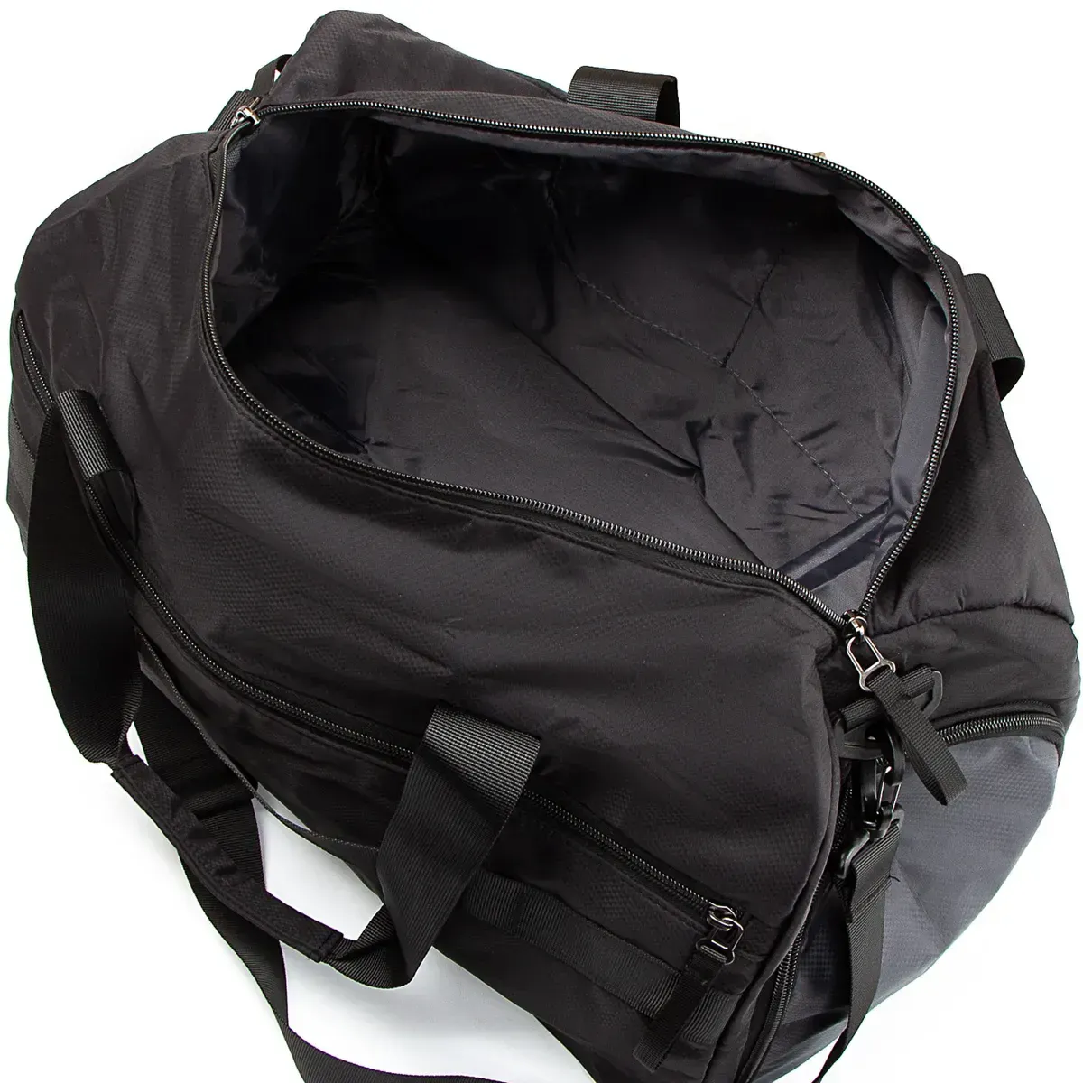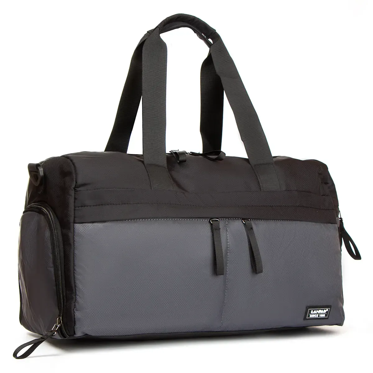 Мужская дорожная/спортивная сумка Lanpad. Одно отделение, закрывается на молнию. Внутри отделения есть карман на молнии и двойной открытый карман. На фасаде находятся два карман на молнии. На обратной стороне расположен большой карман на молнии с герметичной подкладкой. На торцах сумки расположены карман для обуви и карман на молнии.