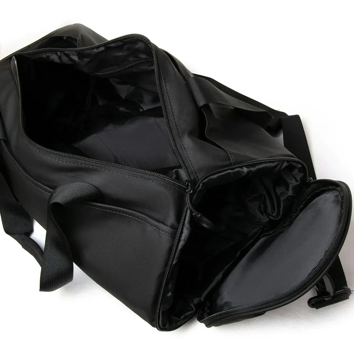 Мужская дорожная/спортивная сумка Lanpad. Одно отделение, закрывается на молнию. Внутри отделения есть карман на молнии и открытый карман. На фасаде находится два вместительных кармана на молнии, а на обратной стороне расположен один большой карман на молнии. На торцах сумки расположены открытые карманы и карман для обуви. Регулируемый плечевой ремень, шириной 4см.