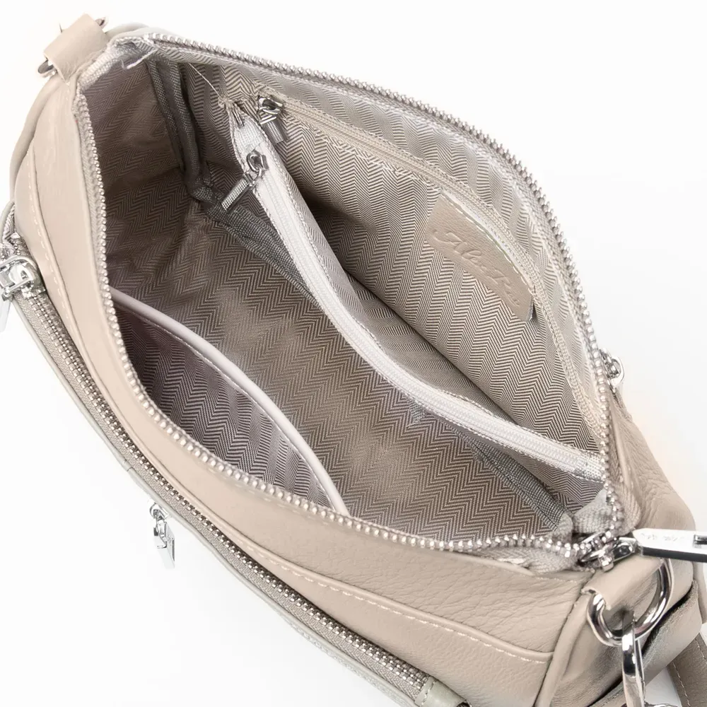 Два отделения, закрываются на молнию. Внутри основного отделения есть карман на молнии и открытый карман. На фасаде и на обратной стороне есть карманы на молнии.