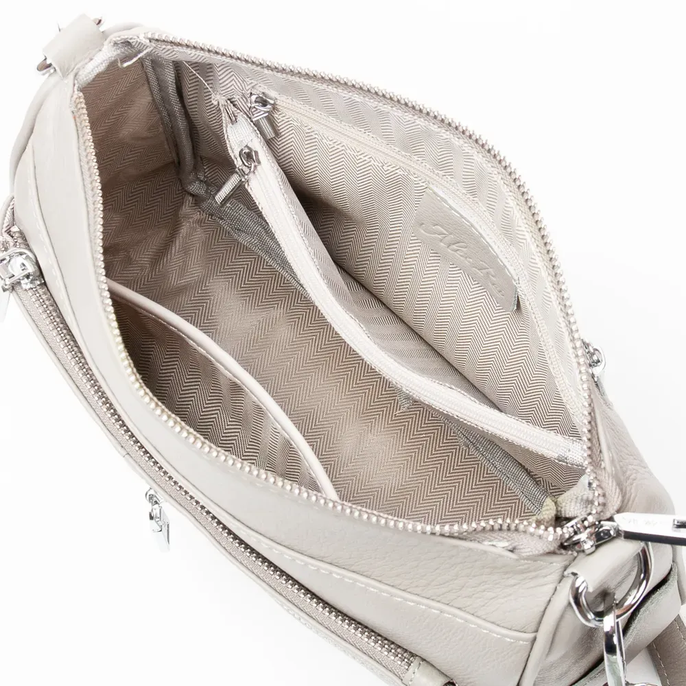 Два отделения, закрываются на молнию. Внутри основного отделения есть карман на молнии и открытый карман. На фасаде и на обратной стороне есть карманы на молнии.