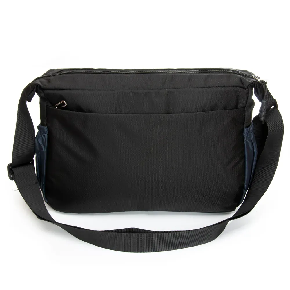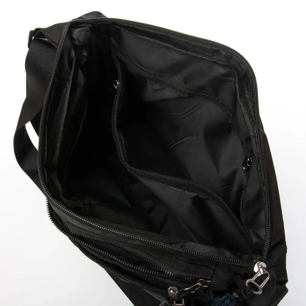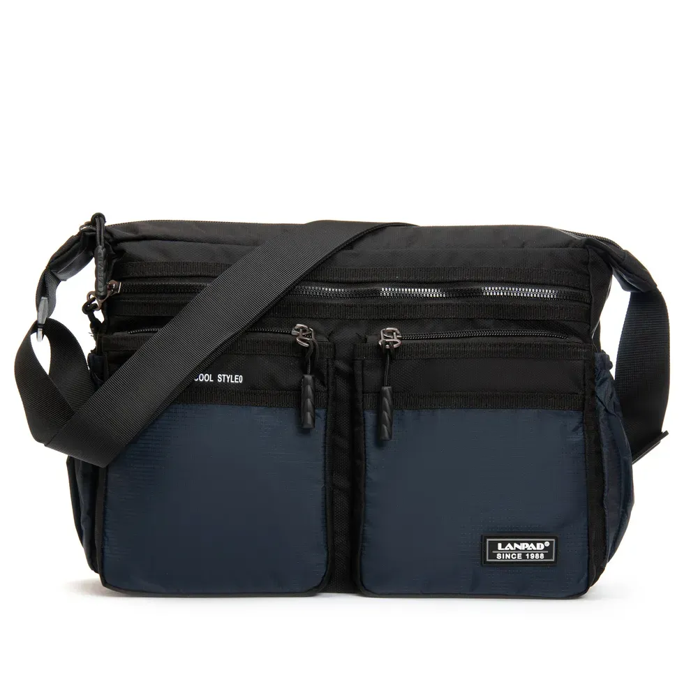 Мужская сумка Lanpad. Закрывается на молнию. Внутри находится двойное отделение, разделенное карманом-перегородкой на молнии, карман на молнии и открытый двойной карман. На фасаде и обратной стороне находятся вместительные карманы на молнии. На торцах сумки также расположены открытые карманы. Регулируемый плечевой ремень, шириной 4см.