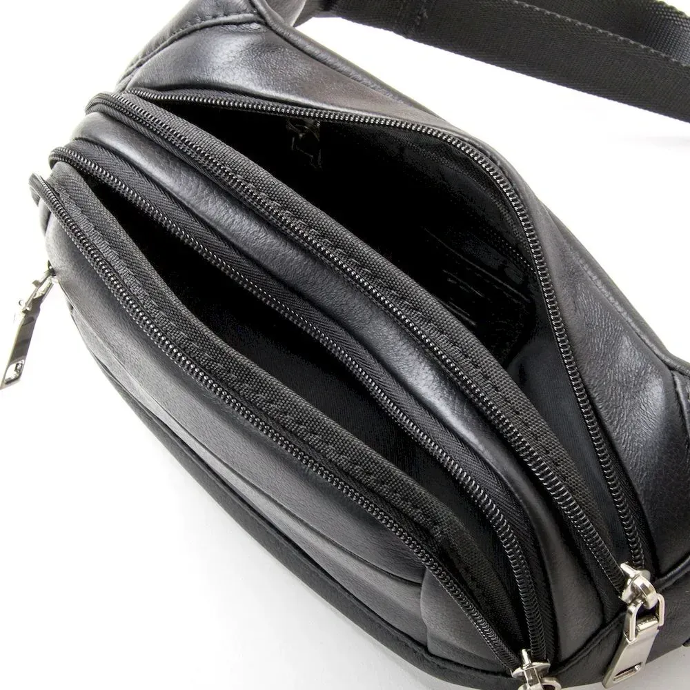 Мужская кожаная сумка Bretton. Можно носить на поясе или через плечо. Два отделения, закрываются на молнию. Внутри одного отделения есть два боковых кармана на молнии. На фасаде и обратной стороне есть карманы на молнии. Регулируемый ремень, шириной 3см.