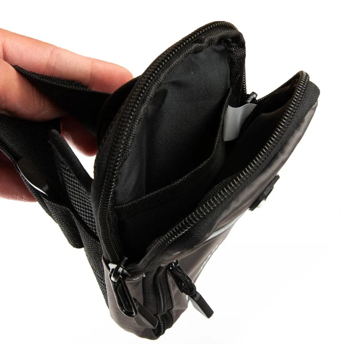 Одно отделение, закрывается на молнию. Внутри есть боковой открытый карман. Помещается смартфон 6,7". На фасаде есть карман на молнии.