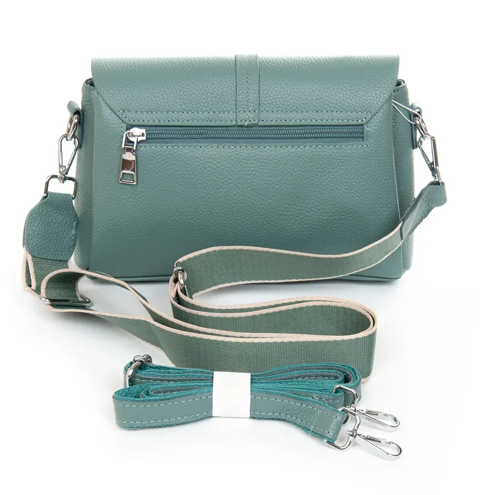 На фасаде сумки расположены два вместительных кармана: один на молнии и второй на магнитной кнопке, а на обратной стороне один карман.