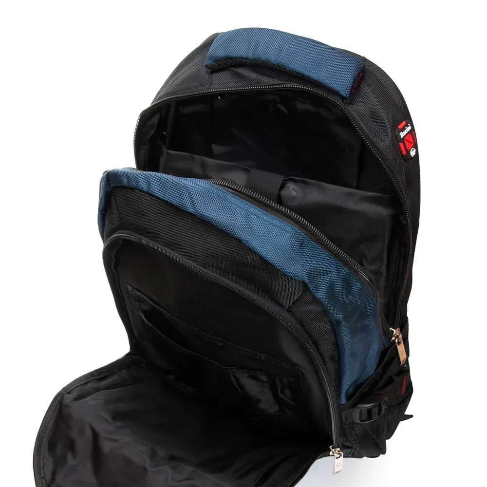 Два отделения, закрываются на молнии. В основном отделении есть боковой карман на молнии и открытый карман.