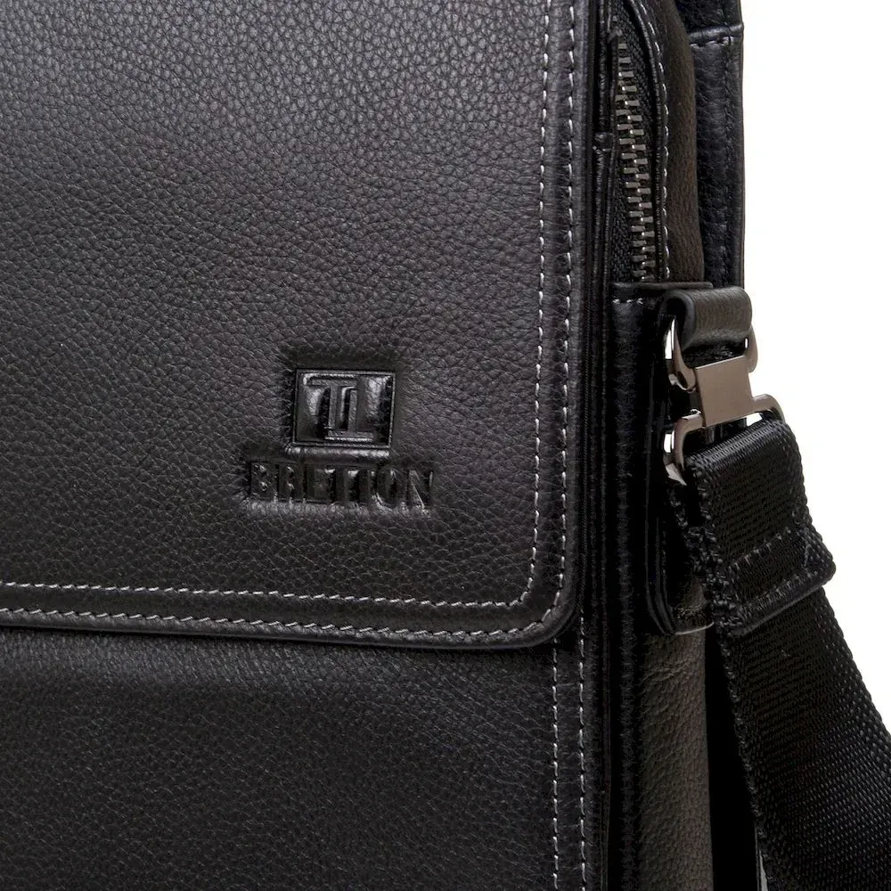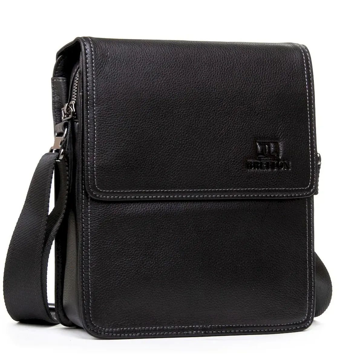 Мужская кожаная сумка-планшет Bretton. Под клапаном находятся три отделения, центральное дополнительно закрывается на молнию. Внутри основного отделения есть боковой открытый карман и карман на молнии. На фасаде сумки есть плоский открытый карман, а на обратной стороне расположен карман на молнии. Регулируемый плечевой ремень.