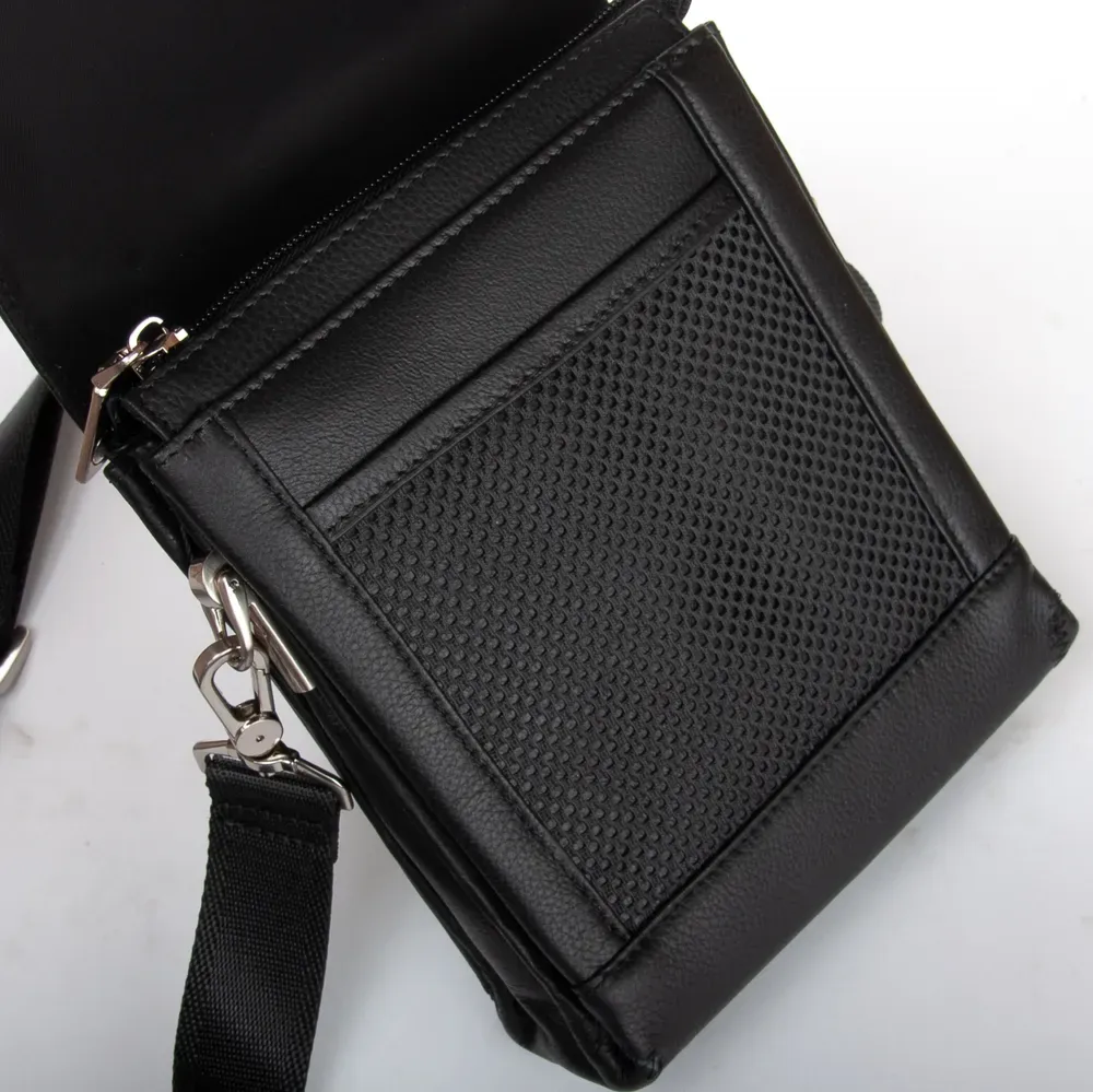 Изготовлена из мягкой натуральной кожи. Под клапаном дополнительно закрывается на молнию. Внутри находятся три отделения (центральное дополнительно закрывается на молнию), разделенные карманом-перегородкой. Внутри отделений есть открытый карман и боковой карман на молнии. Снаружи сумки на фасаде расположен карман-сетка под клапаном.
