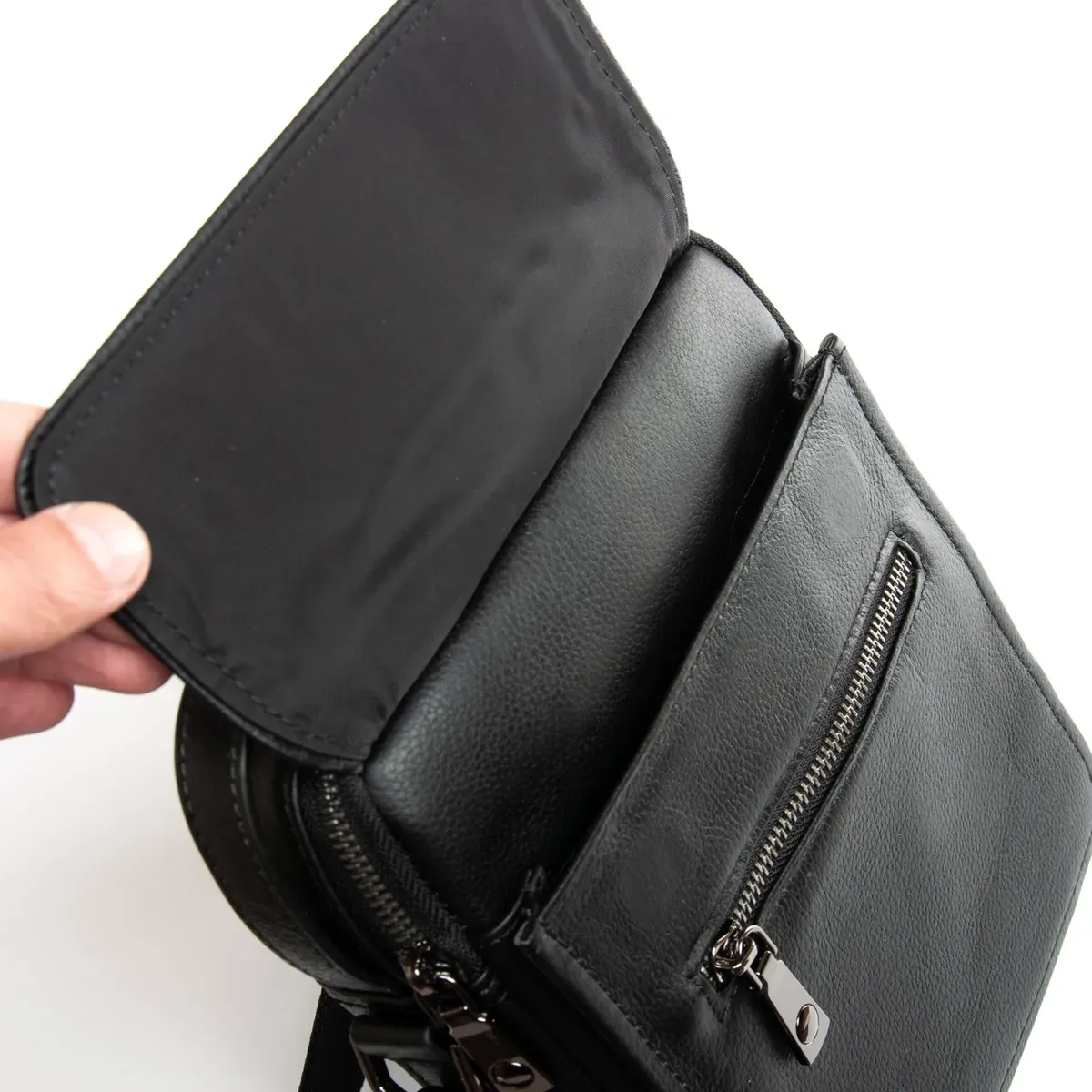 Изготовлена из мягкой натуральной кожи. Одно отделение, закрывается на молнию. Внутри отделения есть открытый карман и боковой карман на молнии. На фасаде находятся один кармана на молнии и один большой под клапаном магните. На обратной стороне сумки есть один карман на магнитной кнопке.
