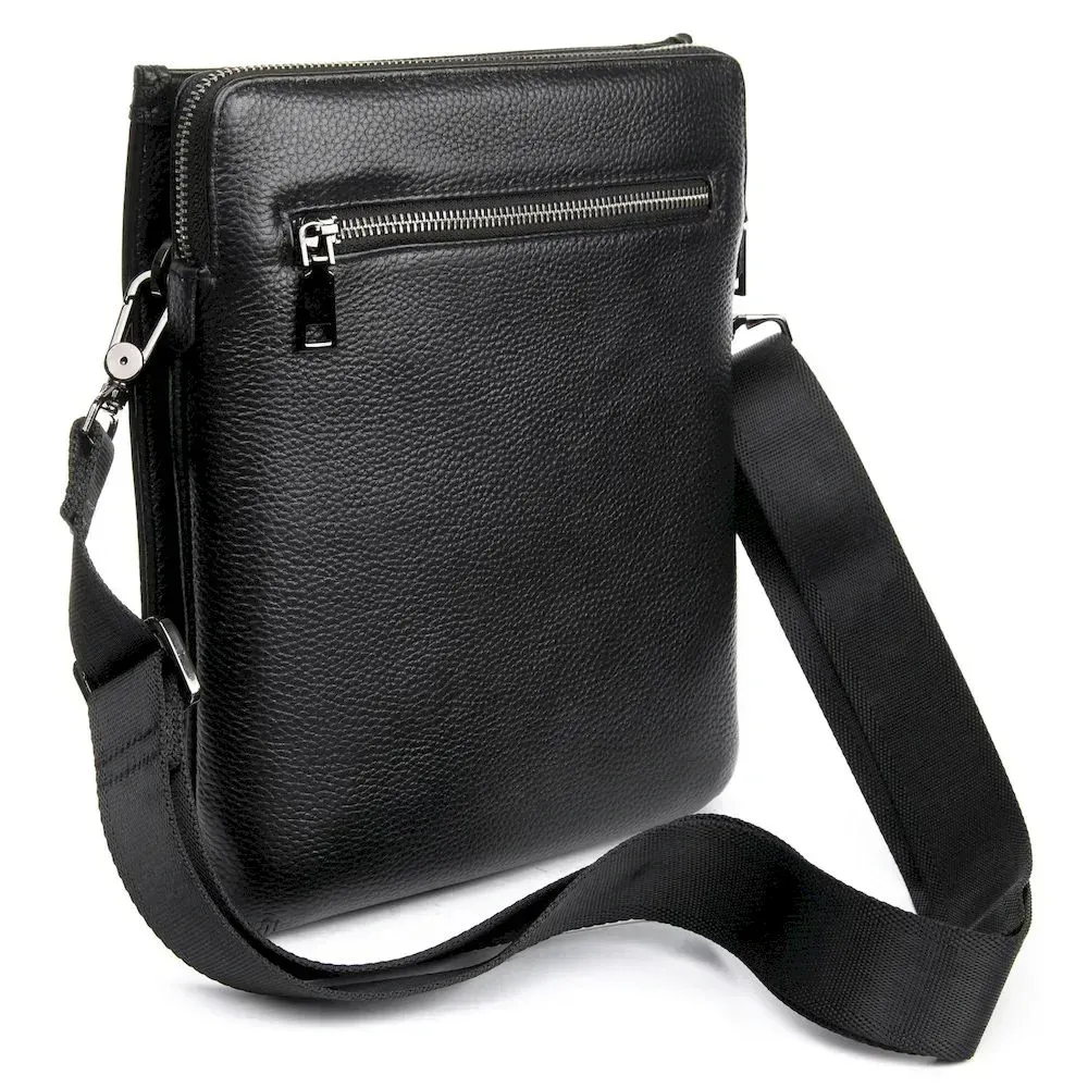 Мужская кожаная сумка-планшет Bretton. Три отделения: боковые закрываются на молнии, а центральное - на магнитную кнопку. Внутри основного отделения есть открытый карман и боковой карман на молнии. На обратной стороне размещен один карман на молнии. Регулируемый плечевой ремень. Размер (см.) 23*27*6