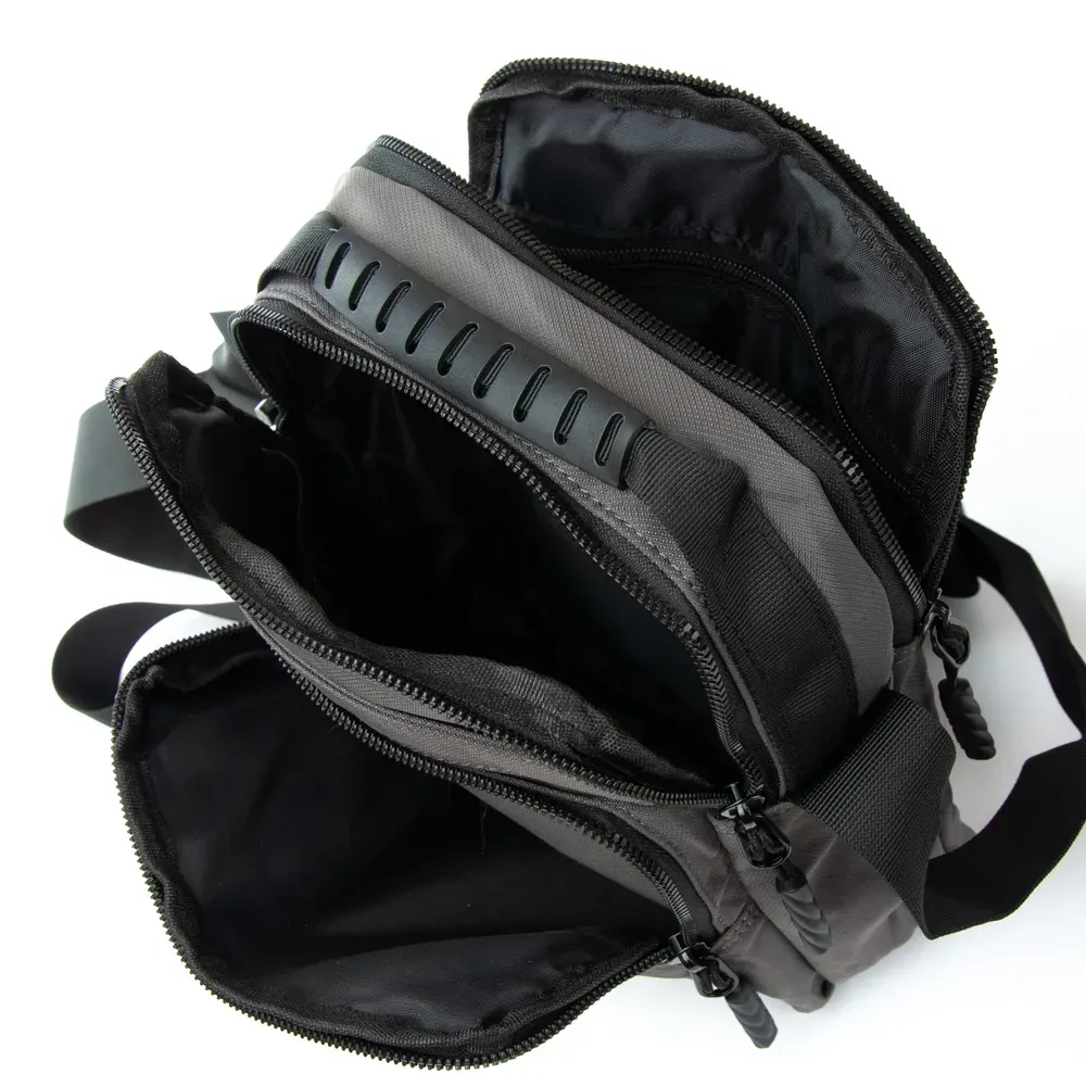 Два больших отделения, закрываются на молнии. Внутри отделений есть боковой карман на молнии и открытый карман. На фасаде расположено два вместительных кармана: один открытый и второй на молнии. На обратной стороне сумки находится один карман на молнии.