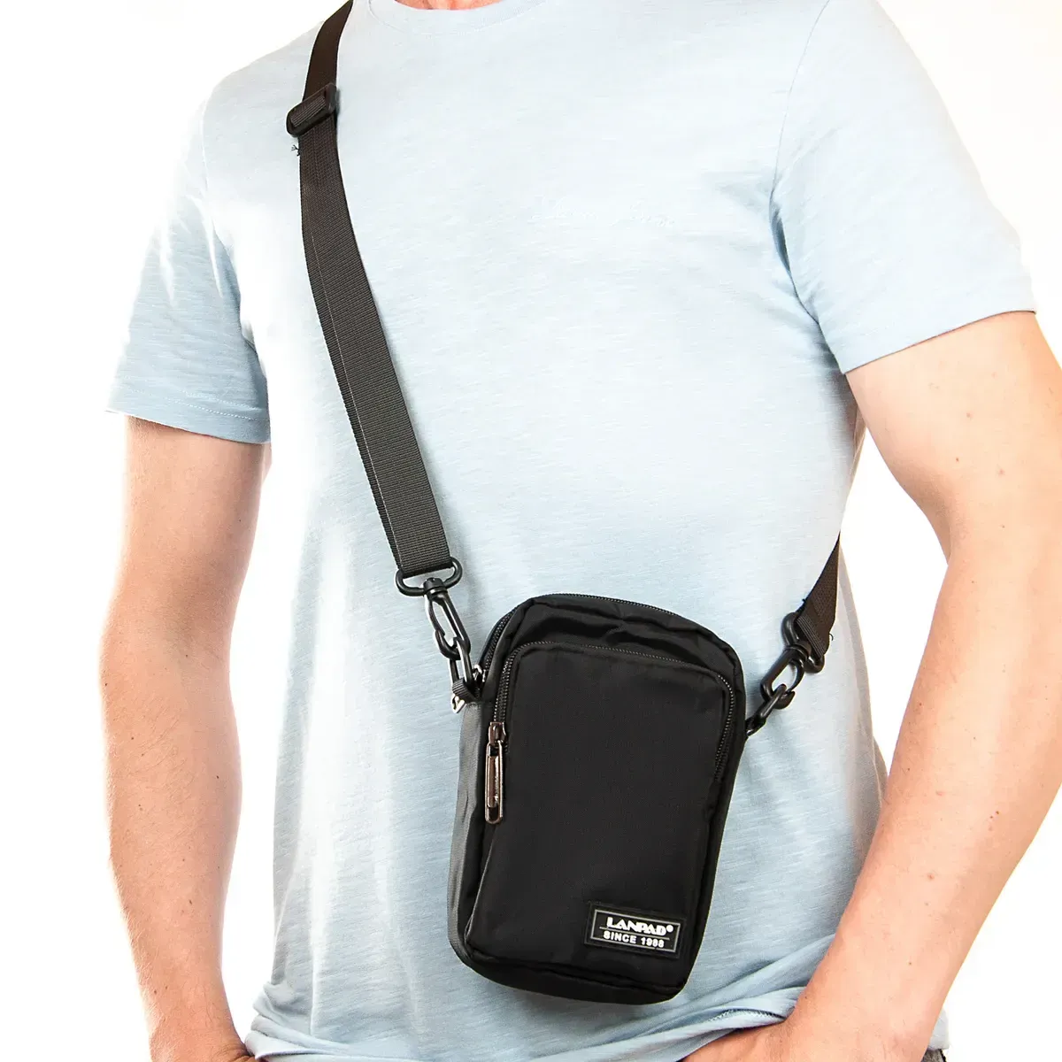 Мужская компактная сумка Lanpad. Два отделения, закрываются на молнию. Внутри отделений расположен карман на молнии и открытый карман. На фасаде расположен карман на молнии. На обратной стороне есть крепление для поясного ремня. Регулируемый плечевой ремень в комплекте.