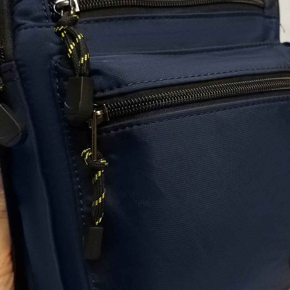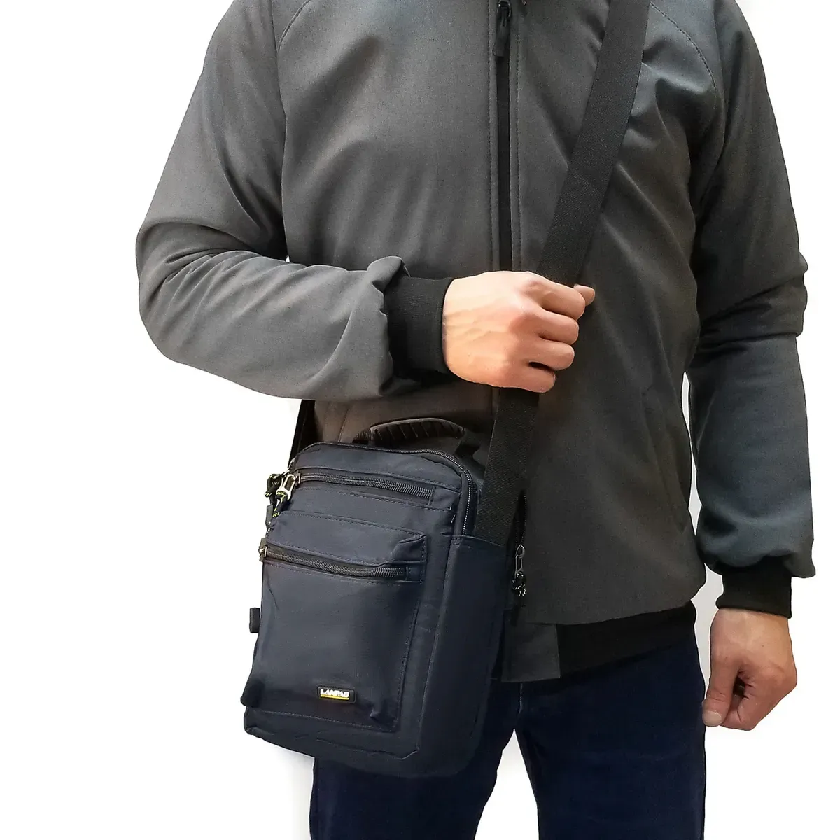 Мужская большая сумка Lanpad. Два отделения, закрываются на молнию. Внутри есть карман на молнии и открытый карман. На фасаде сумки находятся 2 больших карман на молнии и на обратной стороне есть один карман на молнии. Регулируемый плечевой ремень шириной 4см.