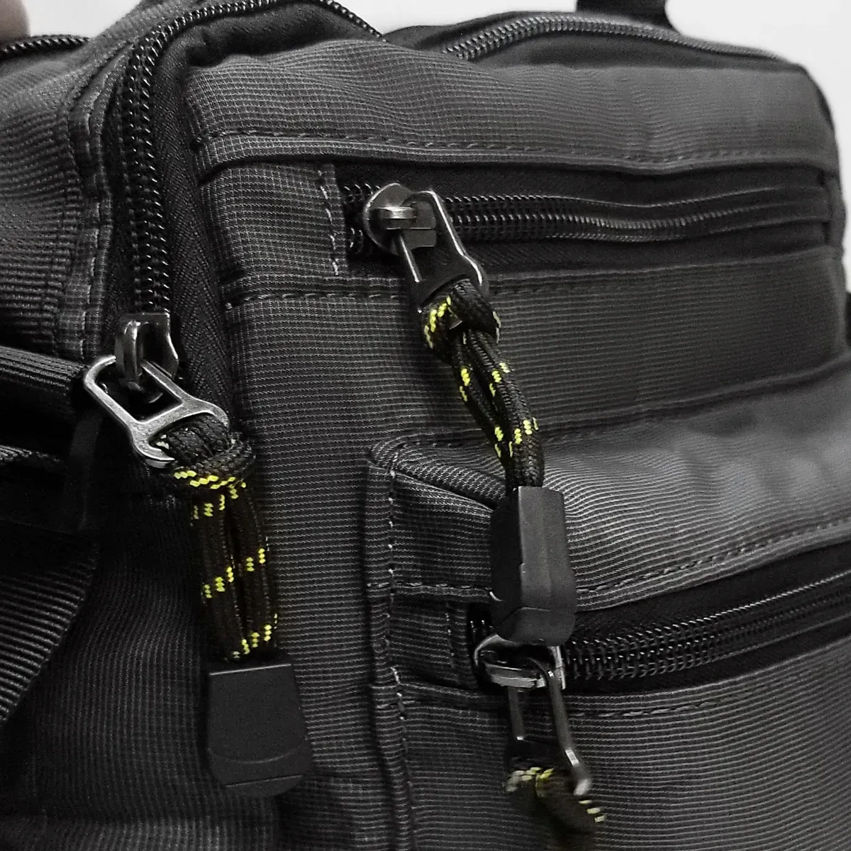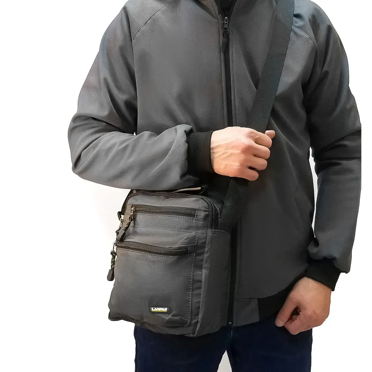 Мужская большая сумка Lanpad. Два отделения, закрываются на молнию. Внутри есть карман на молнии и открытый карман. На фасаде сумки находятся 2 больших карман на молнии и на обратной стороне есть один карман на молнии. Регулируемый плечевой ремень шириной 4см.