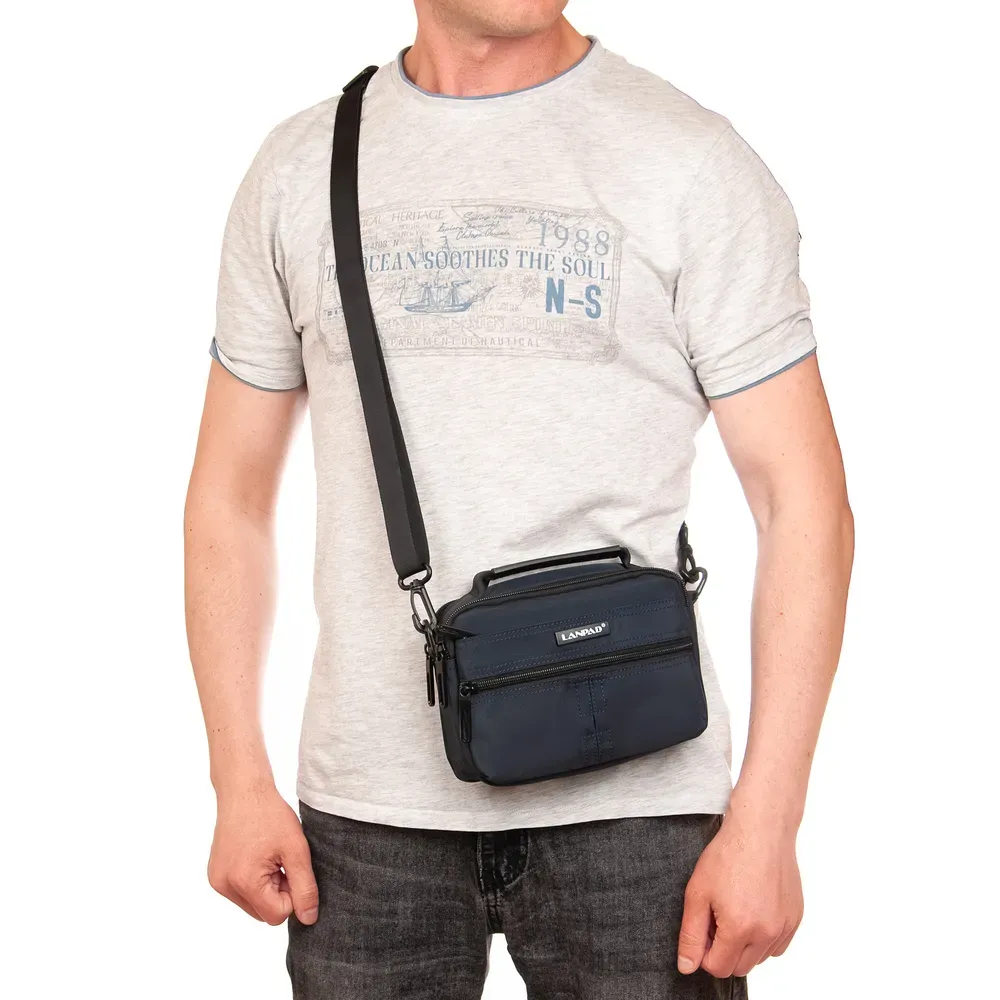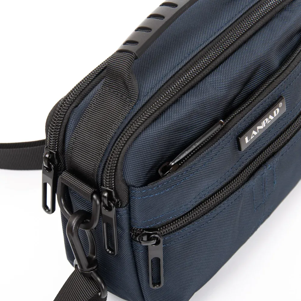 Мужская горизонтальная сумка кросс-боди Lanpad. Два отделения, закрываются на молнии. Внутри отделений есть боковой карман на молнии и открытый карман. На фасаде расположены 2 вместительных кармана на молнии. На обратной стороне есть крепление на пояс.
