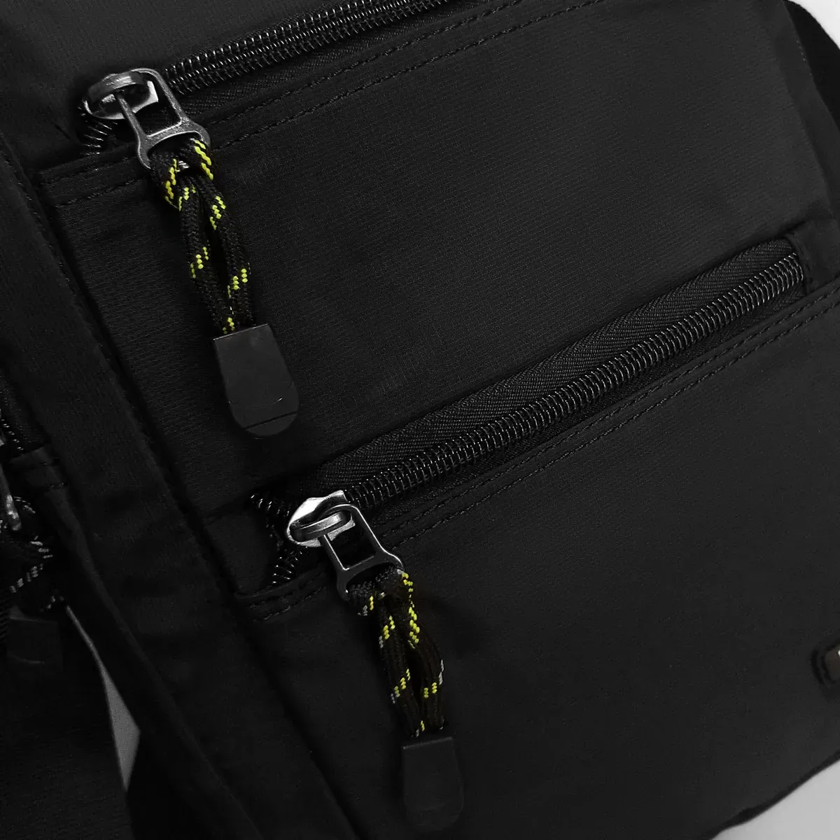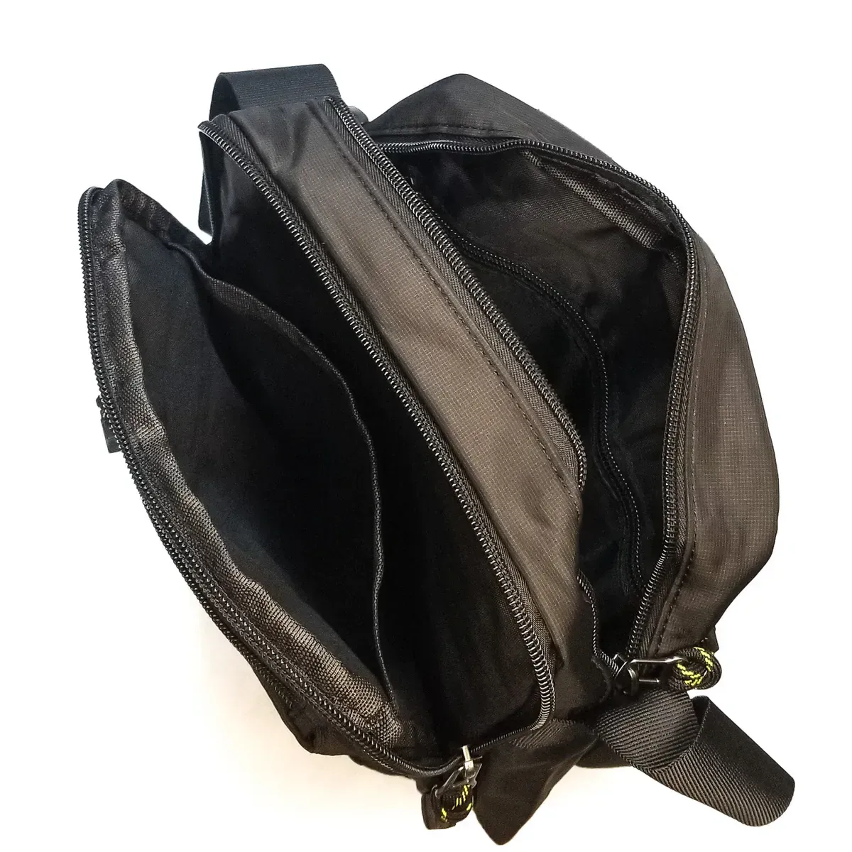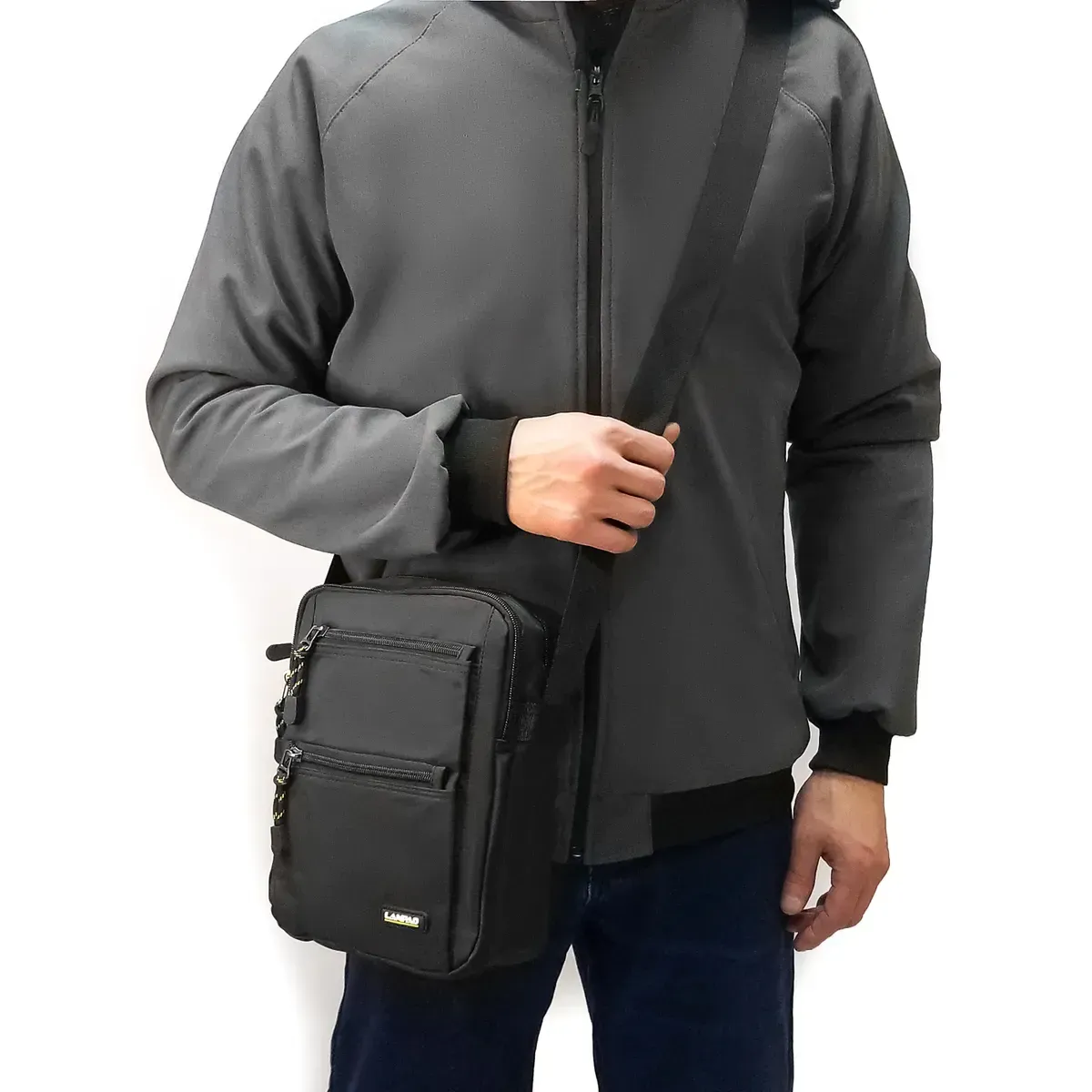 Мужская большая сумка Lanpad. Два отделения, закрываются на молнию. Внутри есть карман на молнии и открытый карман. На фасаде сумки находятся 2 больших карман на молнии и на обратной стороне есть один карман на молнии. Регулируемый плечевой ремень шириной 4см.