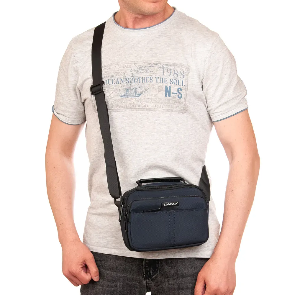 Мужская горизонтальная сумка кросс-боди Lanpad. Два отделения, закрываются на молнии. Внутри отделений есть боковой карман на молнии и открытый карман. На фасаде расположены 2 вместительных кармана на молнии, а на обратной стороне один большой карман на молнии.