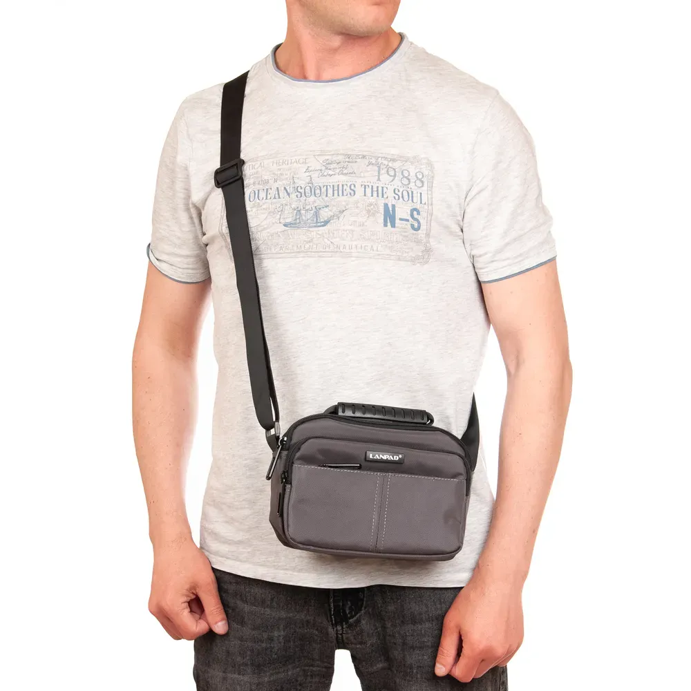 Мужская горизонтальная сумка кросс-боди Lanpad. Два отделения, закрываются на молнии. Внутри отделений есть боковой карман на молнии и открытый карман. На фасаде расположены 2 вместительных кармана на молнии, а на обратной стороне один большой карман на молнии.