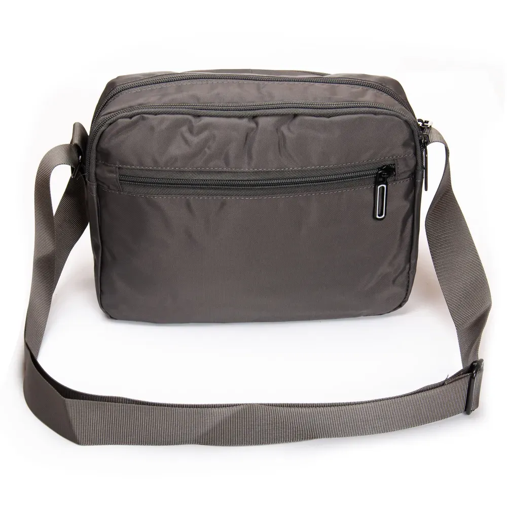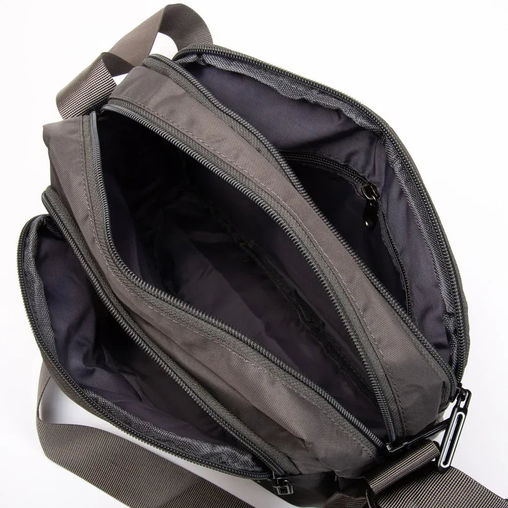 Мужская большая горизонтальная сумка кросс-боди Lanpad. Два отделения, закрываются на молнию. Внутри одного отделения есть карман на молнии. На фасаде и на обратной стороне расположены вместительные карманы на молнии. На фасаде также находится широкий карман на застежке-липучке