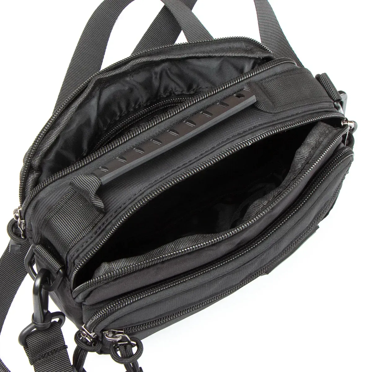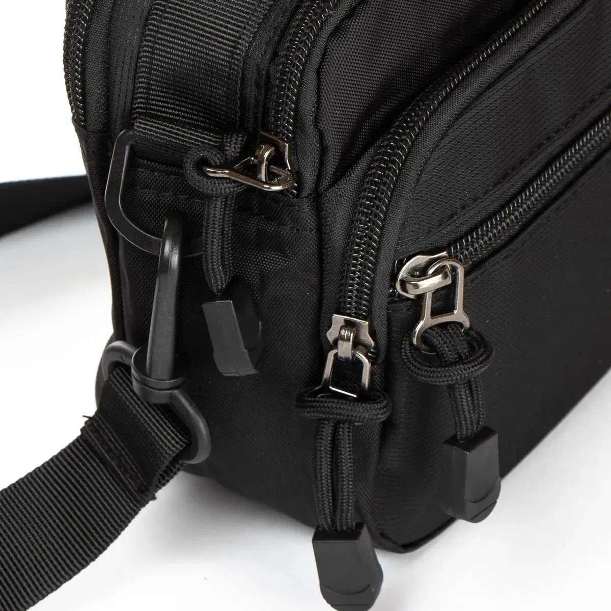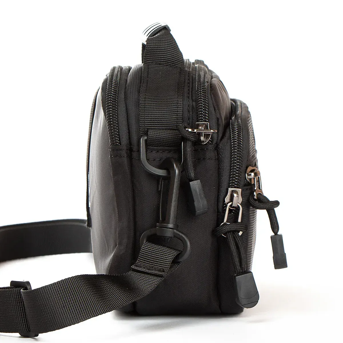 Мужская горизонтальная сумка Lanpad. Два отделения, закрываются на молнию. Внутри отделения есть карман на молнии. На фасаде находятся два кармана на молнии. На обратной стороне есть крепление для ношения сумки на поясе.