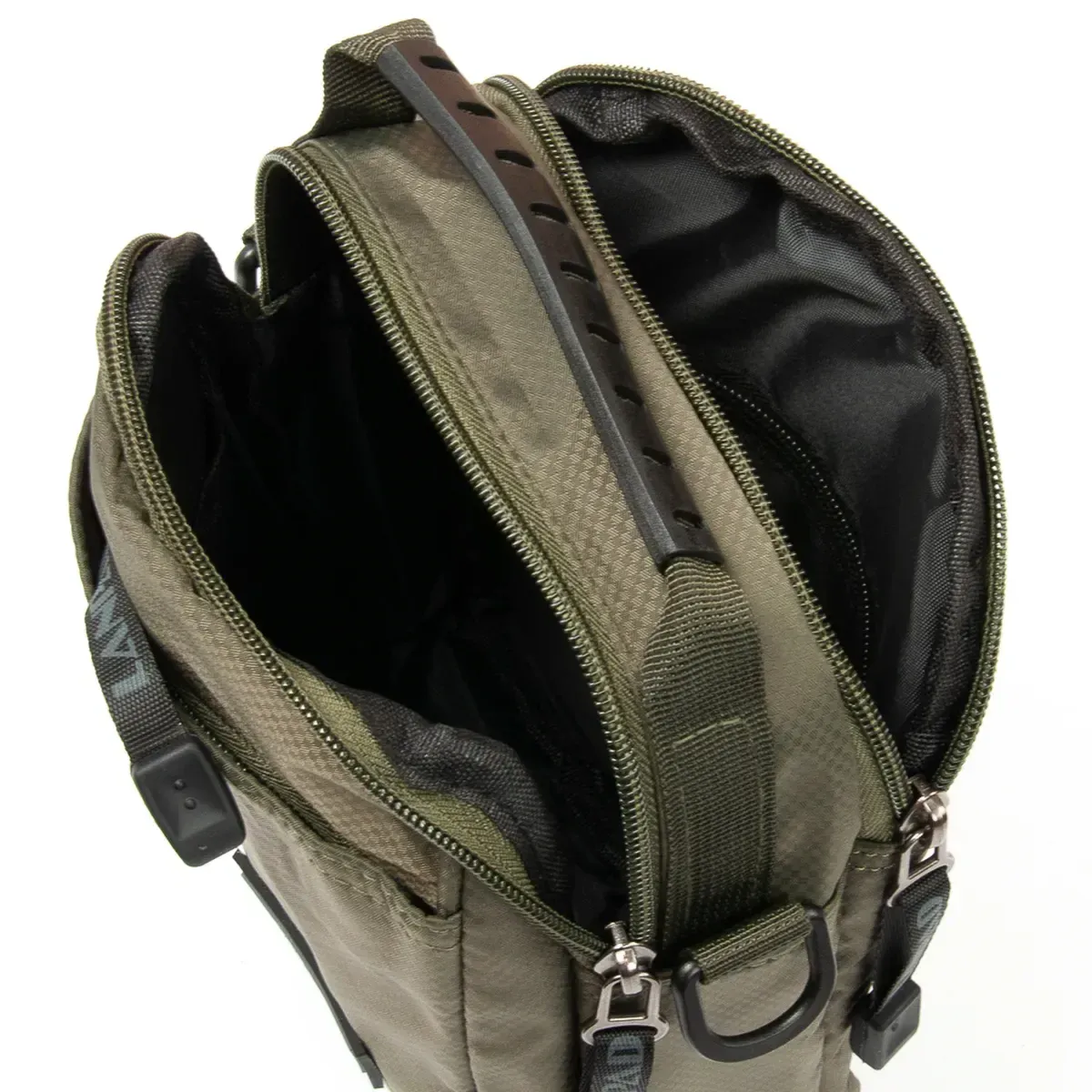 Мужская сумка Lanpad. Два отделения, закрываются на молнию. Внутри отделений есть карман на молнии и открытый карман. На фасаде находится кармана на молнии. На обратной стороне есть крепление на пояс. В комплекте регулируемый плечевой ремень.