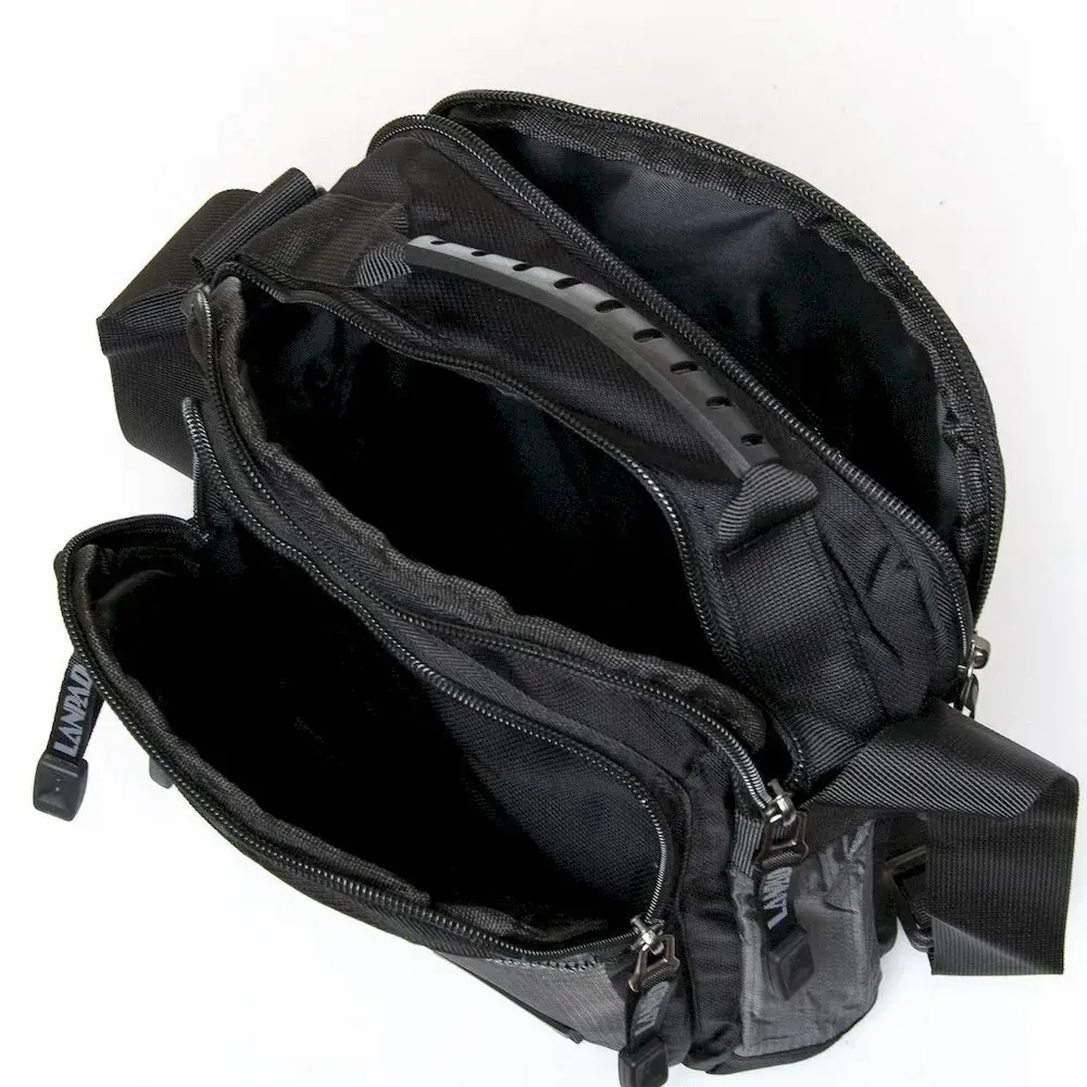 Мужская сумка-планшет Lanpad. Два отделения, закрываются на молнию. Внутри отделений расположен карман на молнии и открытый карман. На фасаде находятся три больших кармана на молнии. На обратной стороне есть один карман на молнии. Регулируемый плечевой ремень шириной 4см.