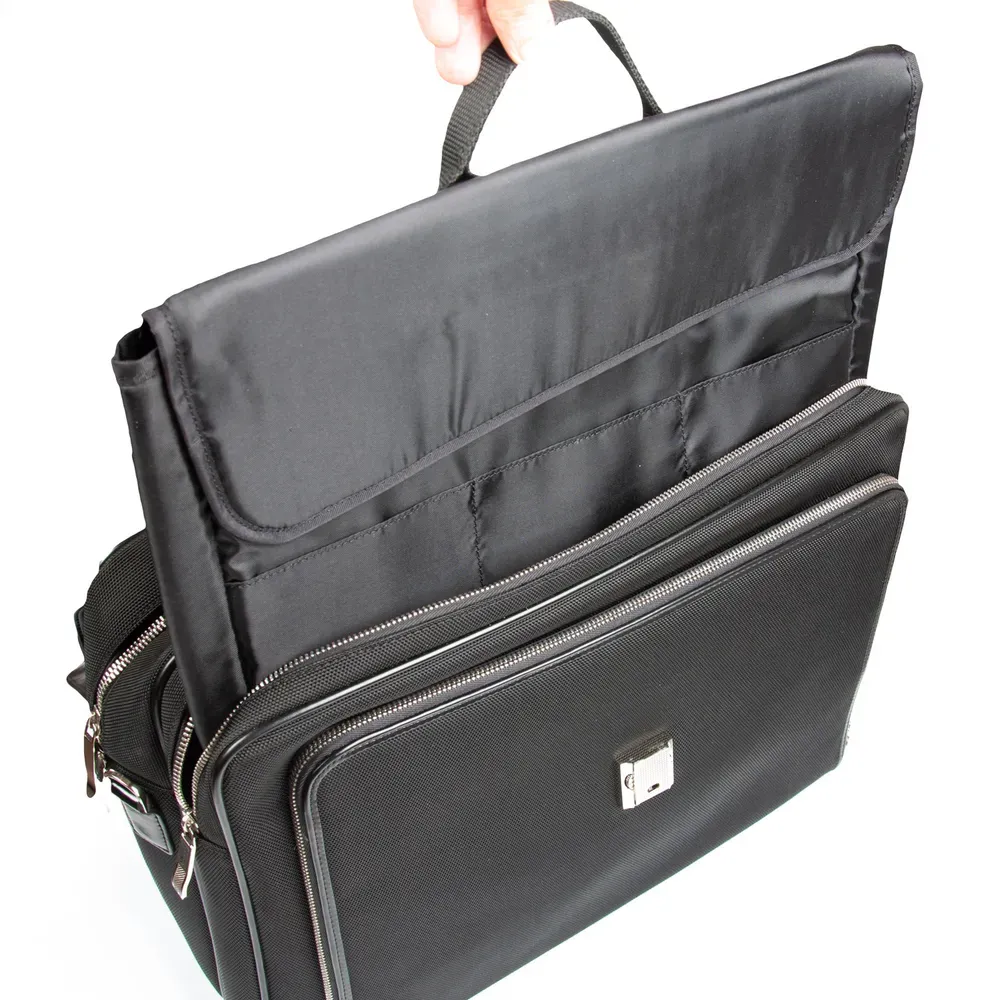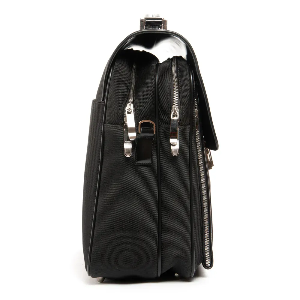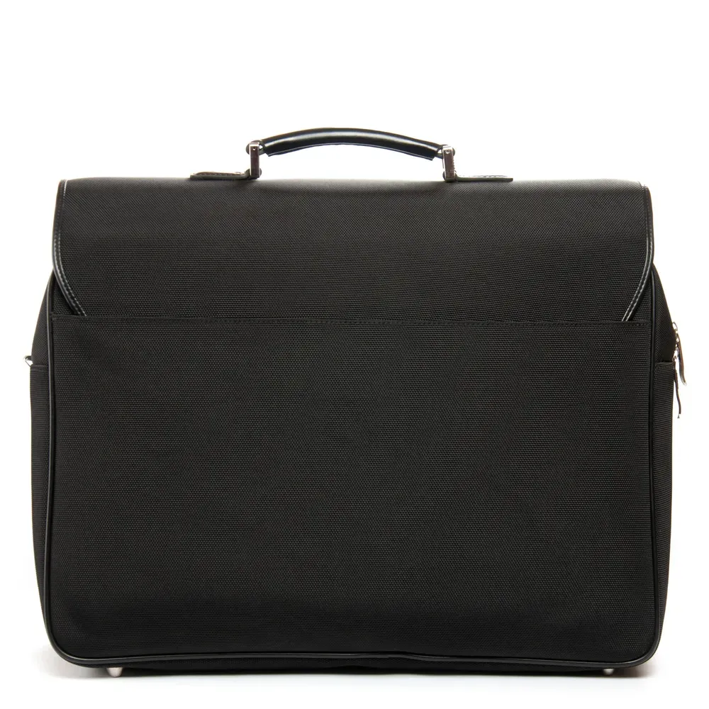 Внутри находятся два отделения на молниях. Внутри отделений есть боковой карман на молнии и открытые карманы. На фасаде расположен большой карман на молнии с внутренними отделениями для визиток, ручек и бумаг. Снаружи портфеля на обратной стороне есть большой плоский открытый карман.