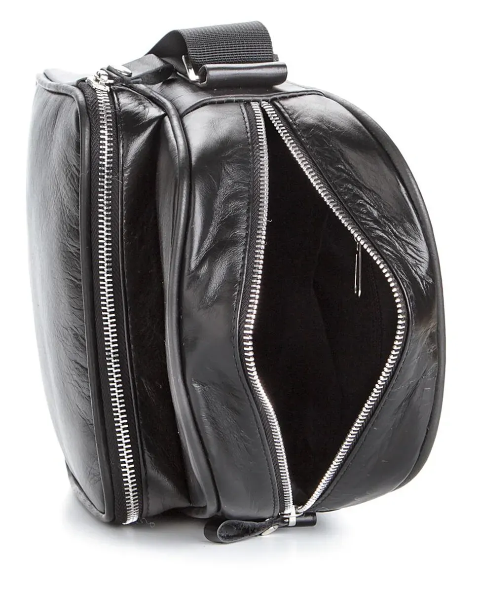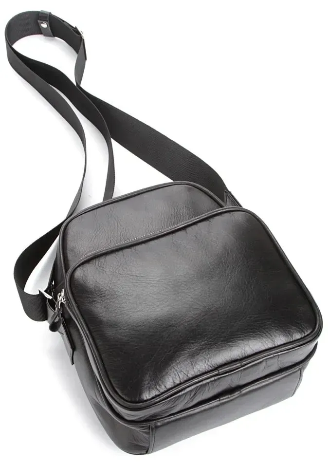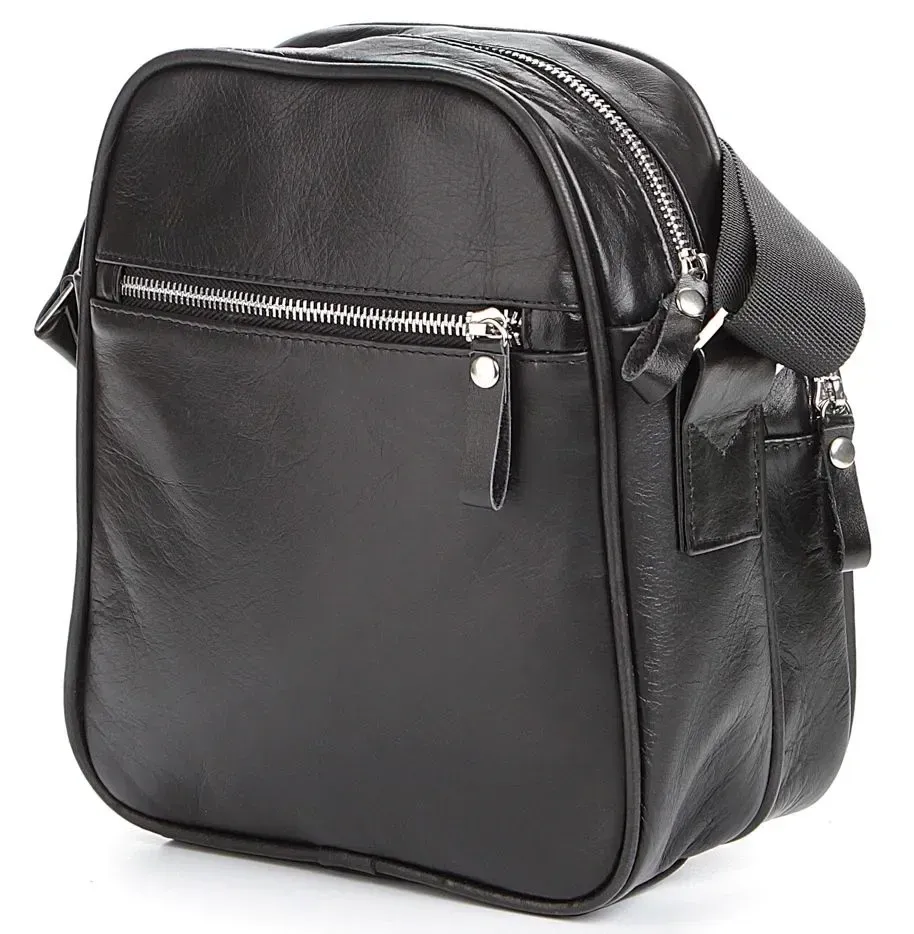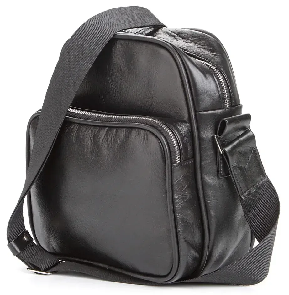 Эксклюзивная мужская сумка ручной работы. Аксессуар выполнен из гладкой кожи черного цвета. Цвет фурнитуры: серебро. Сумка носиться через плечо при помощи регулируемого плечевого ремня. Ручка для ношения сумки в руке не предусмотрена. Подкладка выполнена из текстильного материала черного цвета.