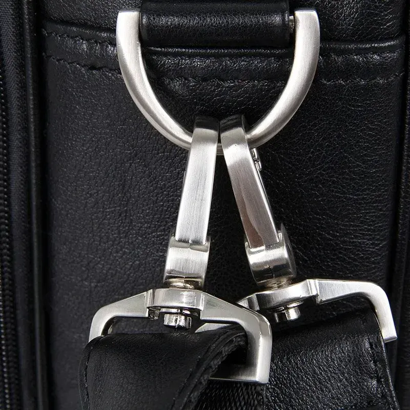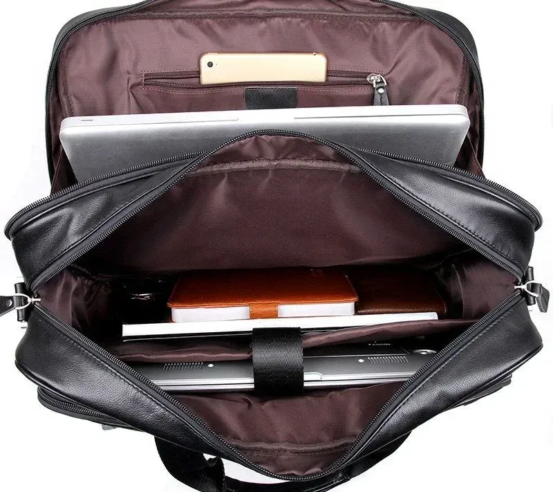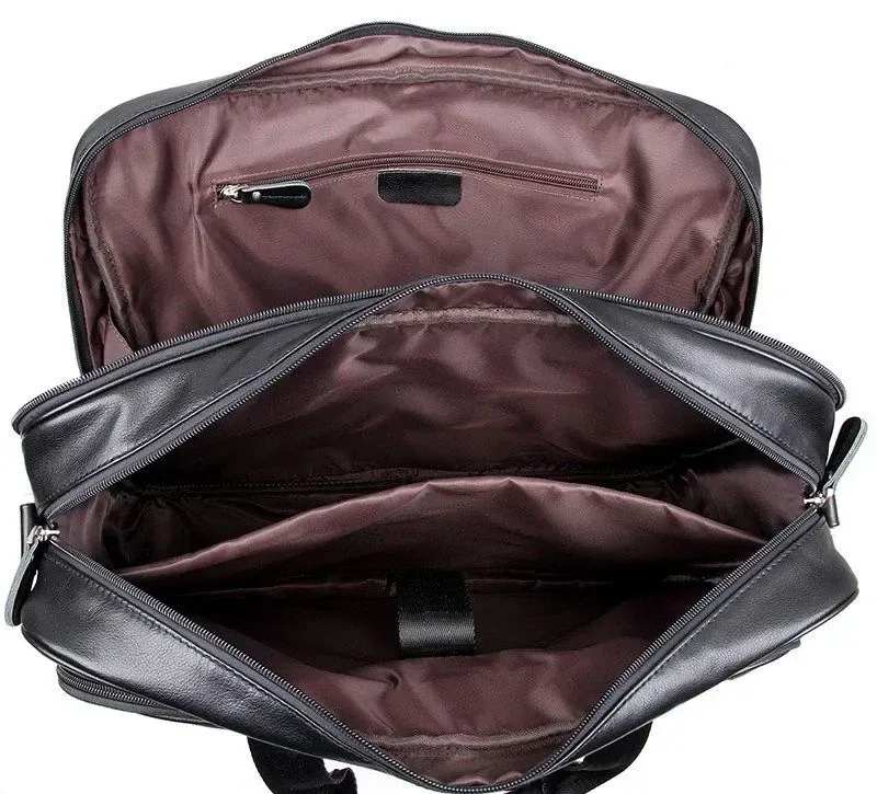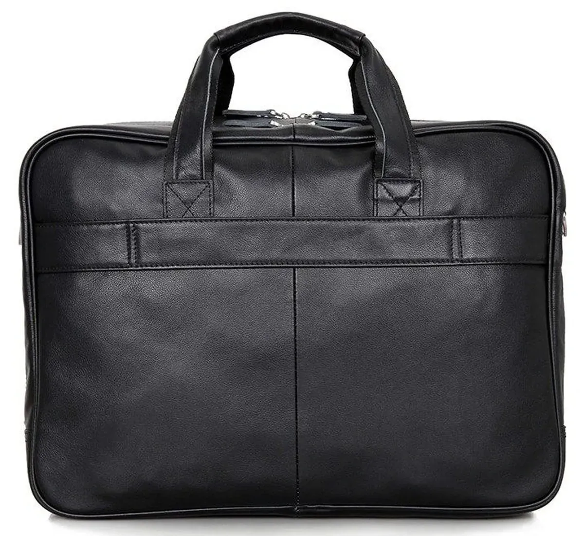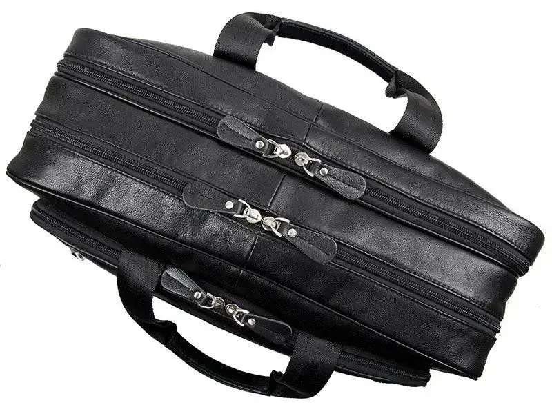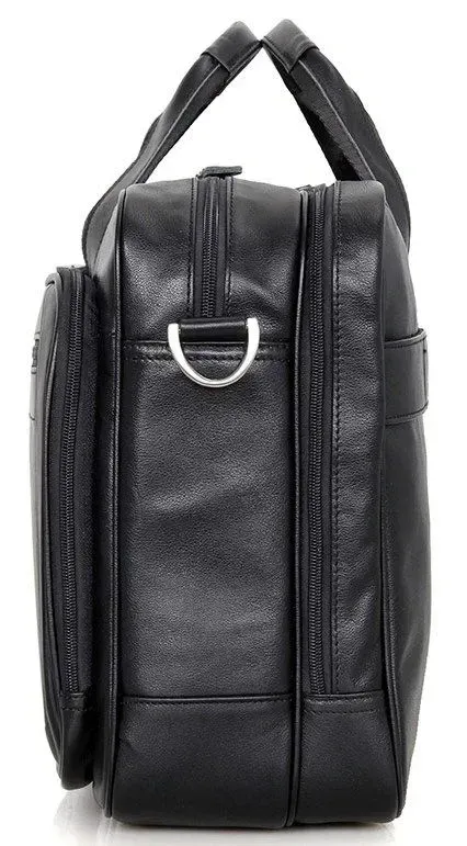 Элитная мужская сумка для ноутбука до 17-ти дюймов. Аксессуар выполнен из натуральной высококачественной кожи черного цвета. Цвет фурнитуры: серебро. Переносить данную модель можно в руке, или через плечо (в комплекте съемный, регулируемый плечевой ремень). На лицевой стороне расположен потайной карман на молнии, а также огромное отделение на молнии в котором Вы найдете:
