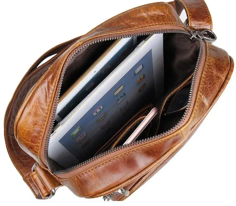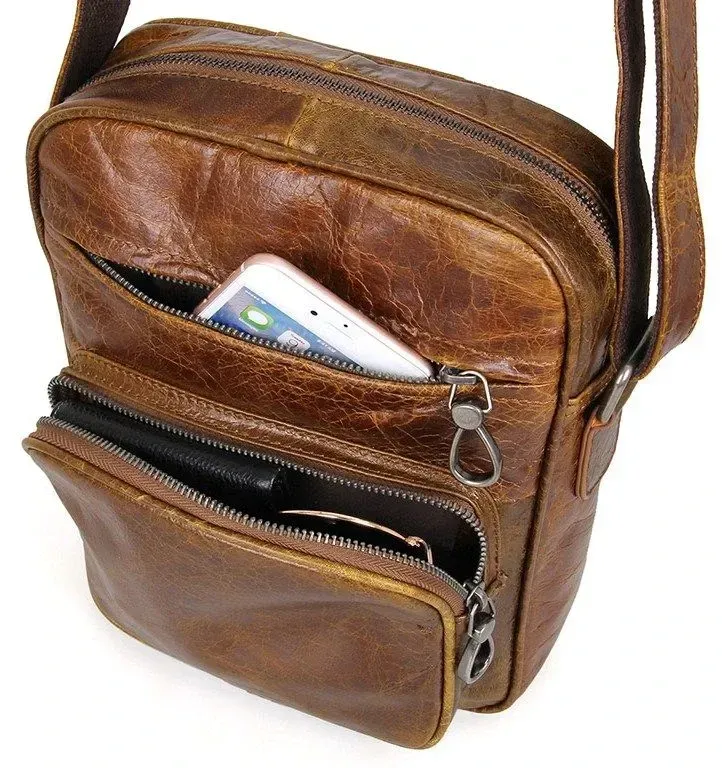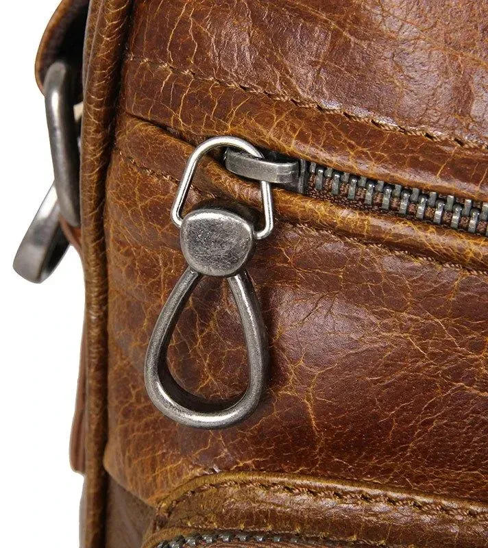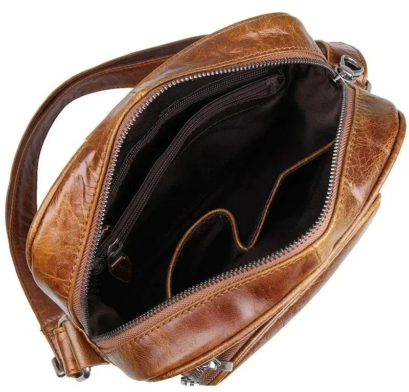 Вместительная мужская кожаная сумка в винтажном стиле. Аксессуар выглядит очень стильно и дорого. Изделие аккуратно прошито прочно коричневой нитью. На лицевой стороне расположены 2 отделения на молнии. На задней внешней стороне находится вместительный накладной карман. Сумка закрывается при помощи металлической молнии. Внутри: два небольших накладных карманчика, потайное отделение на молнии, отделение перегородка на молнии.