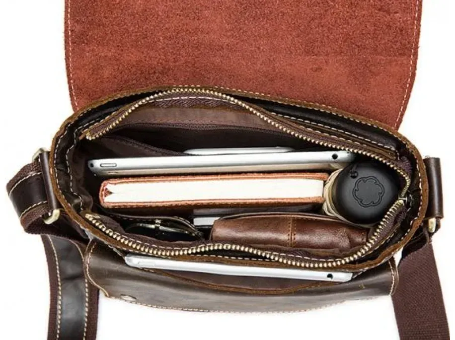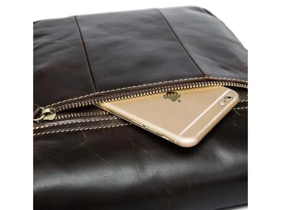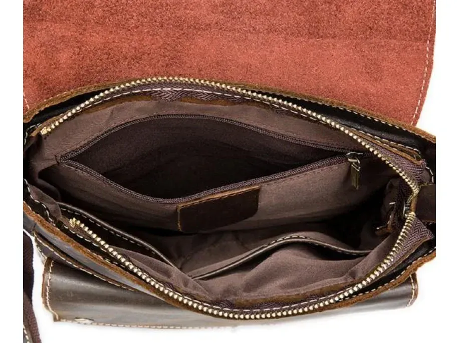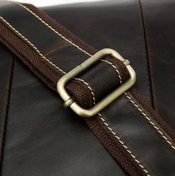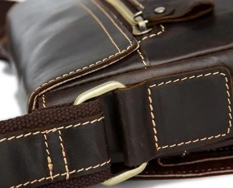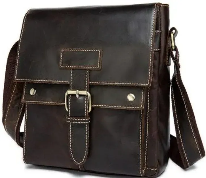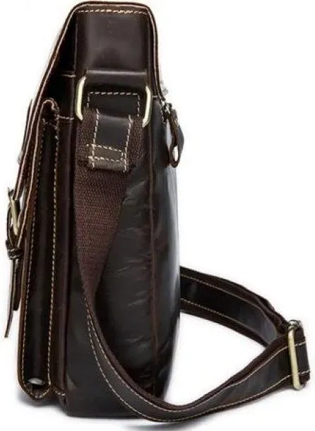 Красивая мужская сумка через плечо. Аксессуар выполнен из натуральной высококачественной гладкой кожи, мягкой и приятной на ощупь. Цвет фурнитуры: латунь. Сумка надежно прошита прочной светло-коричневой нитью. Швы - ровные, аккуратные. Аксессуар упакован в белый пылезащитный чехол