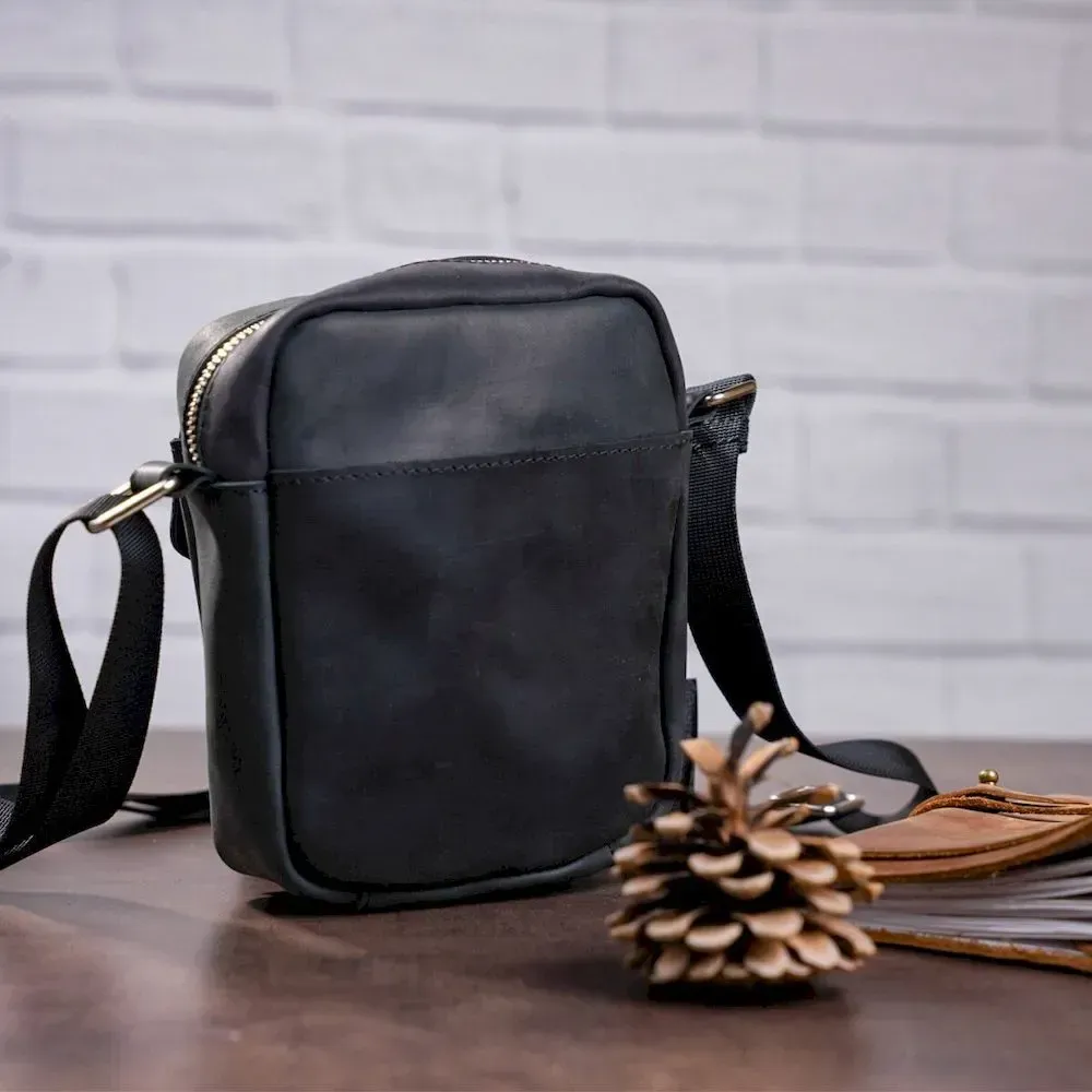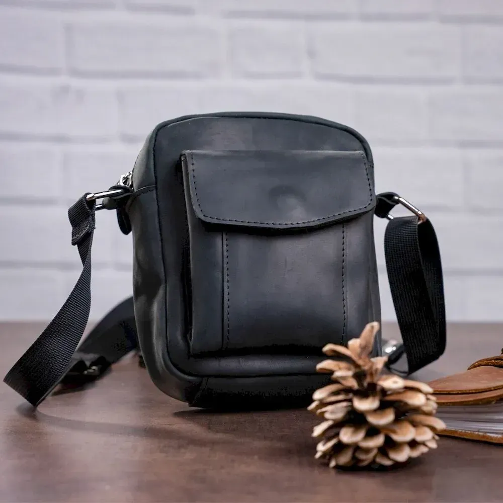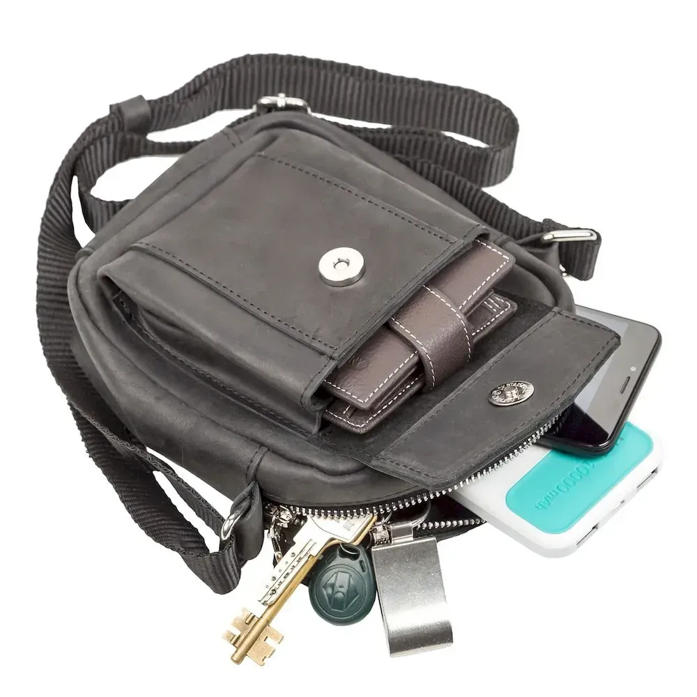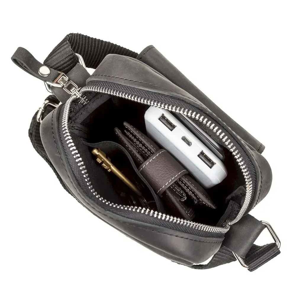 Для производства использовали кожу Crazy horse, особенностью, которой есть потертости и неоднородность окраса. Сумочка компактная, но в свою очередь, довольно вместительна. С легкостью вмещает: телефон, документы, ключи.