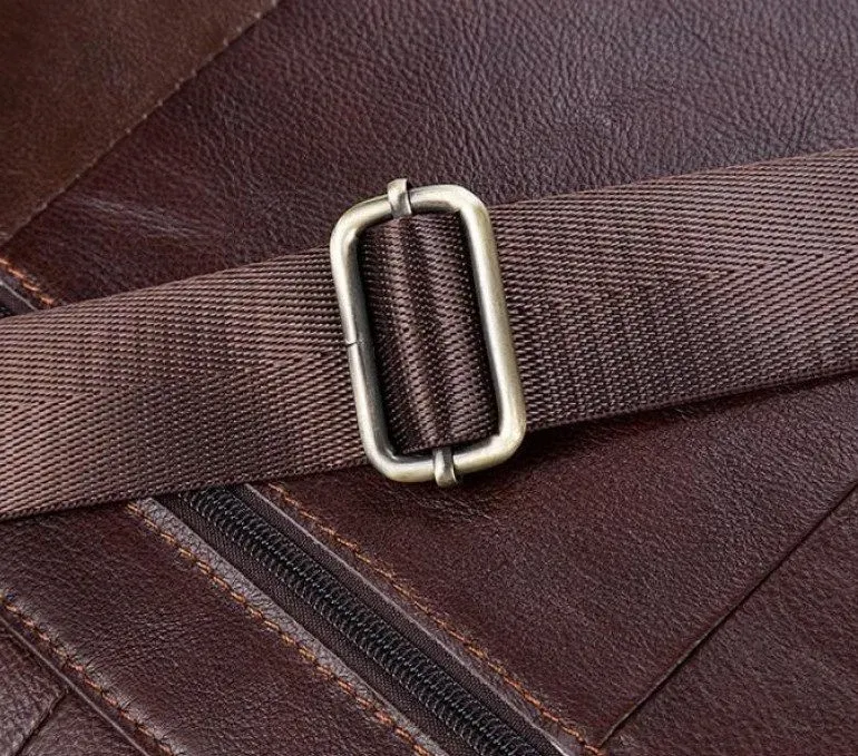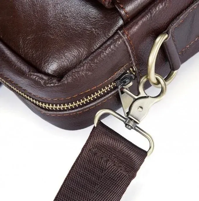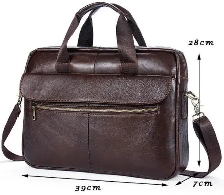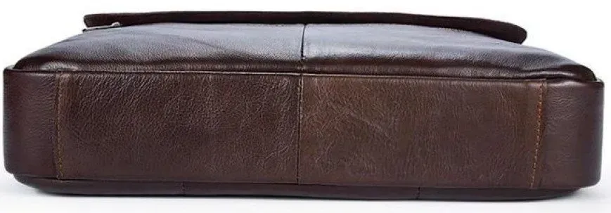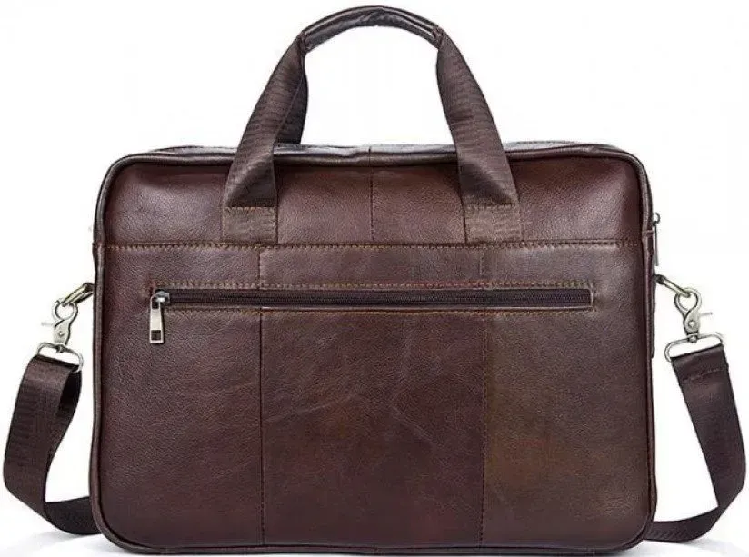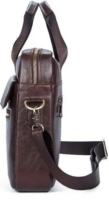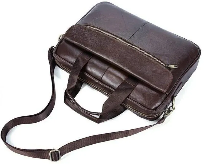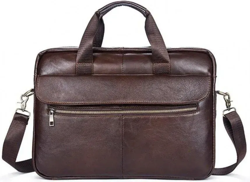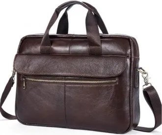 Многофункциональная коричневая мужская сумка с отделением для небольшого ноутбука 15”, а также документов формата А4. Аксессуар выполнен из натуральной зернистой кожи коричневого цвета. На лицевой стороне данного изделия расположены два вместительных отделения, одно под клапаном на магнитах и другое на молнии. На задней внешней стороне находится еще одно отделение на молнии. Сумку можно переносить в руке при помощи удобных кожано-текстильных ручек, а также через плечо (в комплекте съемный, регулируемый плечевой ремень, который выполнен из текстильного материала). Цвет фурнитуры: латунь.