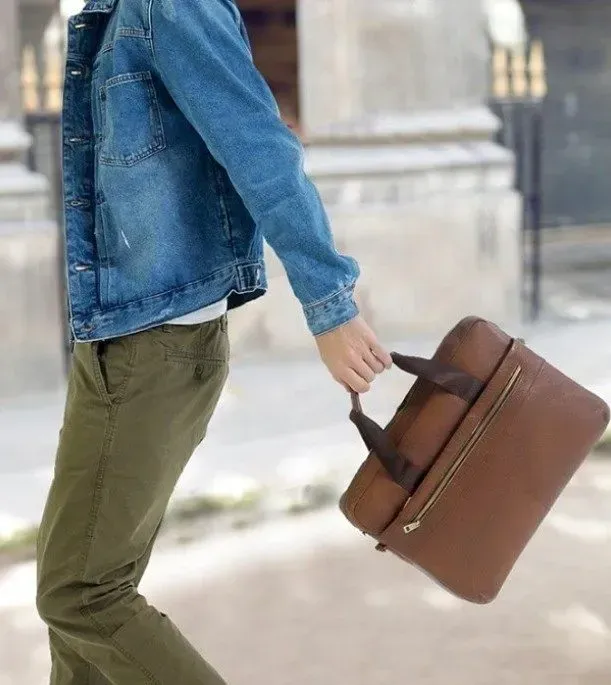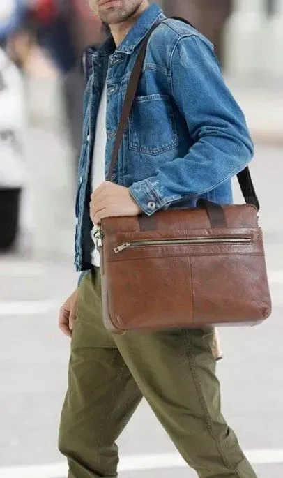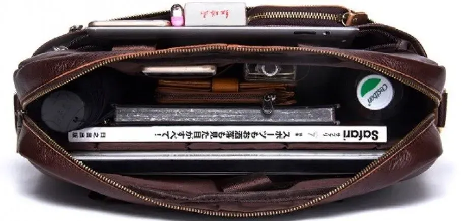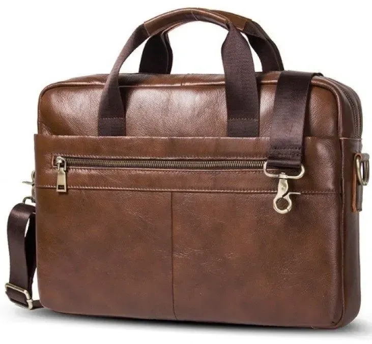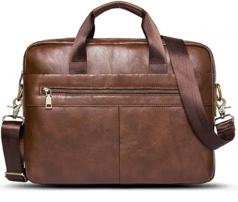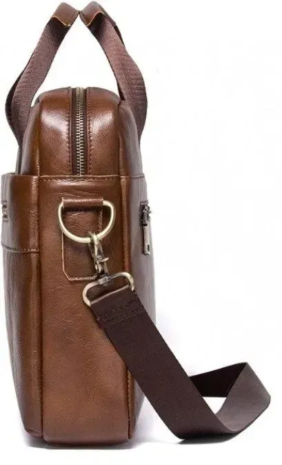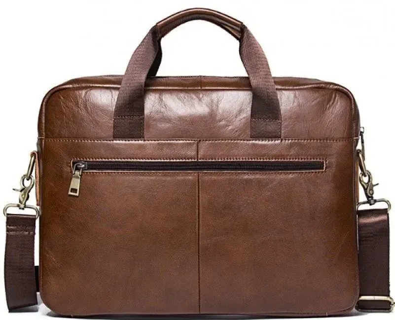 Многофункциональная коричневая мужская сумка с отделением для небольшого ноутбука 15”, а также документов формата А4. Аксессуар выполнен из натуральной гладкой кожи коричневого цвета. На лицевой стороне данного изделия расположены два вместительных отделения, на молниях. На задней внешней стороне находится еще одно отделение на молнии. Сумку можно переносить в руке при помощи удобных кожано-текстильных ручек, а также через плечо (в комплекте съемный, регулируемый плечевой ремень, который выполнен из текстильного материала). Цвет фурнитуры: латунь.