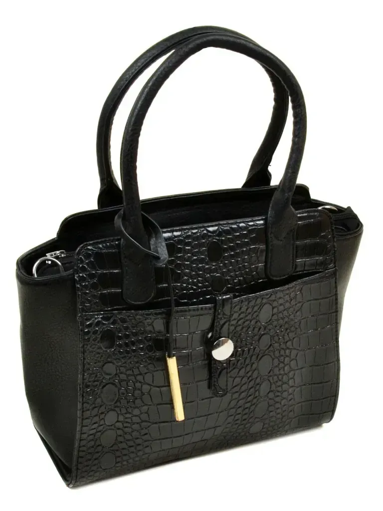Женская сумка. Фасад- текстура "рептилия". Закрывается на молнию. Внутри двойное отделение, разделенное карманом-перегородкой на молнии, двойной открытый карман и карман на молнии. На фасаде карман с декоративным клапаном. Снаружи сумки на обратной стороне карман на молнии. В комплекте регулируемый плечевой ремень. Размер (см.) 35*26*13, высота ручки 17см.