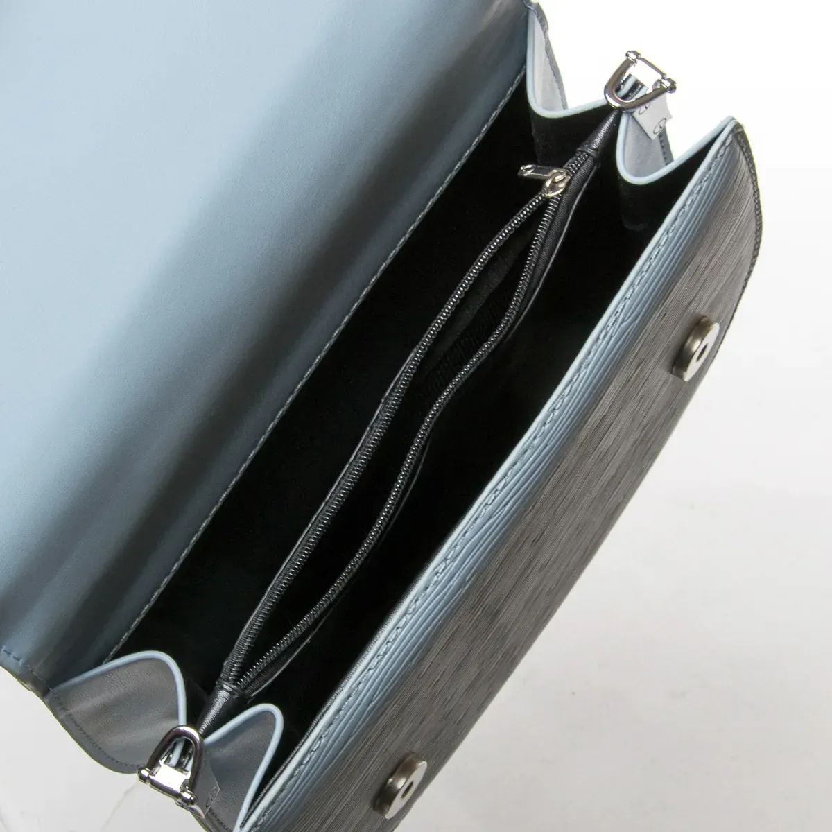 Женская компактная сумочка Fashion. Под клапаном находится двойное отделение разделенное карманом-перегородкой на молнии. В комплекте регулируемый плечевой ремень и сьемная ручка-цепочка.
