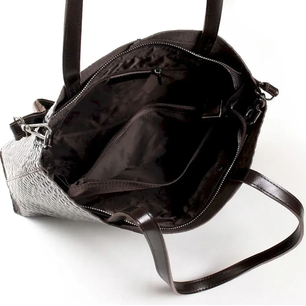Большая женская сумка Alex Rai. Изготовлена из натуральной плотной кожи. Закрывается на молнию. Внутри находится двойное отделение, разделенное карманом-перегородкой на молнии, двойной открытый карман и карман на молнии. На обратной стороне расположен карман на молнии. В комплекте регулируемый плечевой ремень.