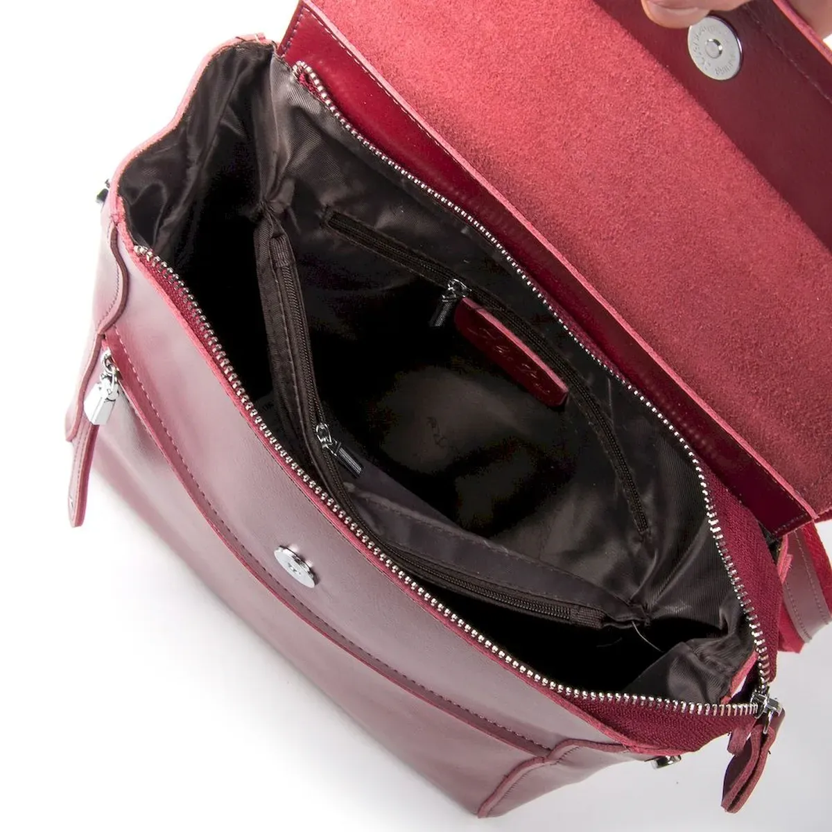Закрывается на молнию. Внутри находится двойное отделение, разделенное карманом-перегородкой на молнии, открытый большой карман и боковой карман на молнии. На фасаде расположеы два открытых плоских кармана, а на обратной стороне один карман на молнии.